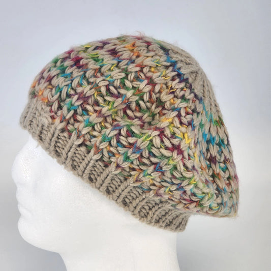 Hand Knitted Tan Beret Hat Rainbow Accents Soft 100% Acrylic Slouchy Beanie Cap