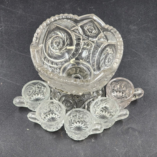 EAPG Pedestal Mini Punch Bowl Clear Glass Spinning Star US Glass 5 Mini Cups Vtg