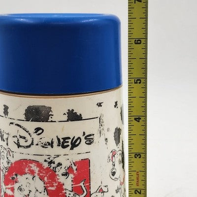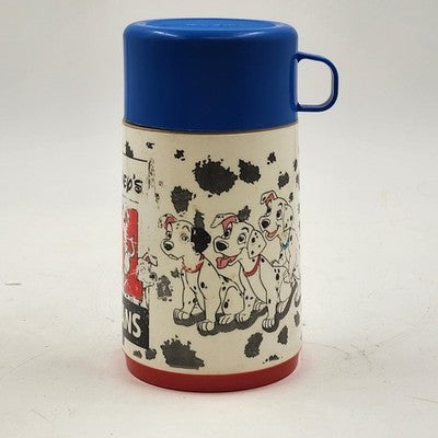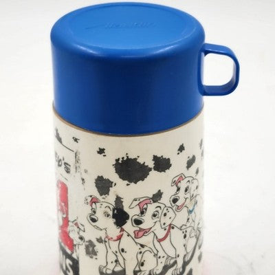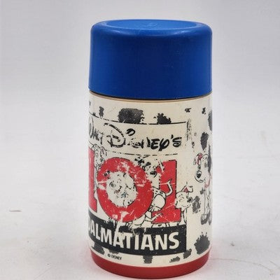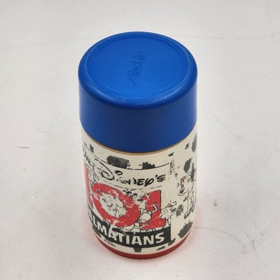 Charming Disney's 101 Dalmatians collectible plastic lunch thermos made by Aladdin, featuring colorful graphics of the beloved pups. Comes with a blue screw-on lid that doubles as a cup-perfect for vintage lunchbox sets or Disney collections.