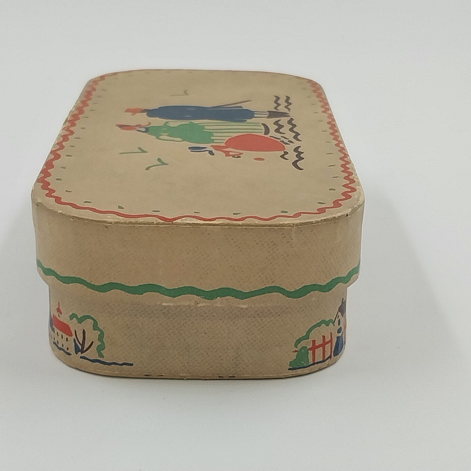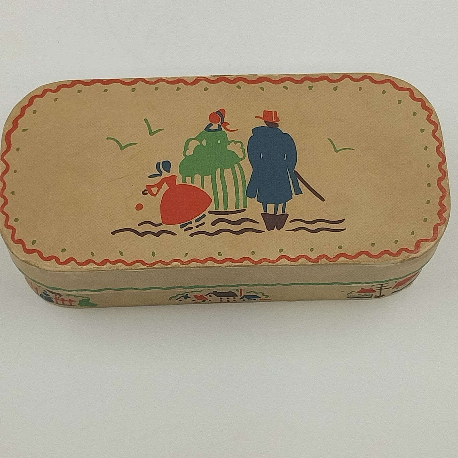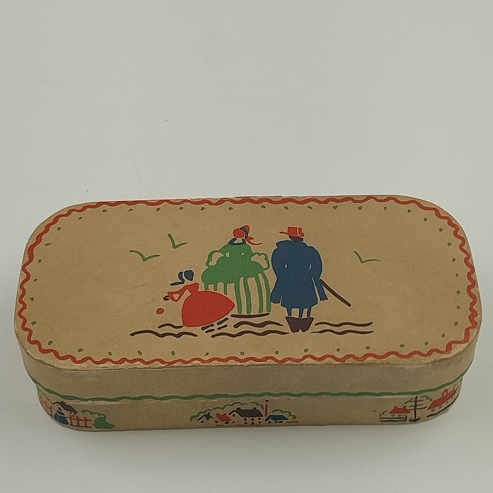 * It features a decorative design with figures in colonial attire on the lid and a village scene around the sides.