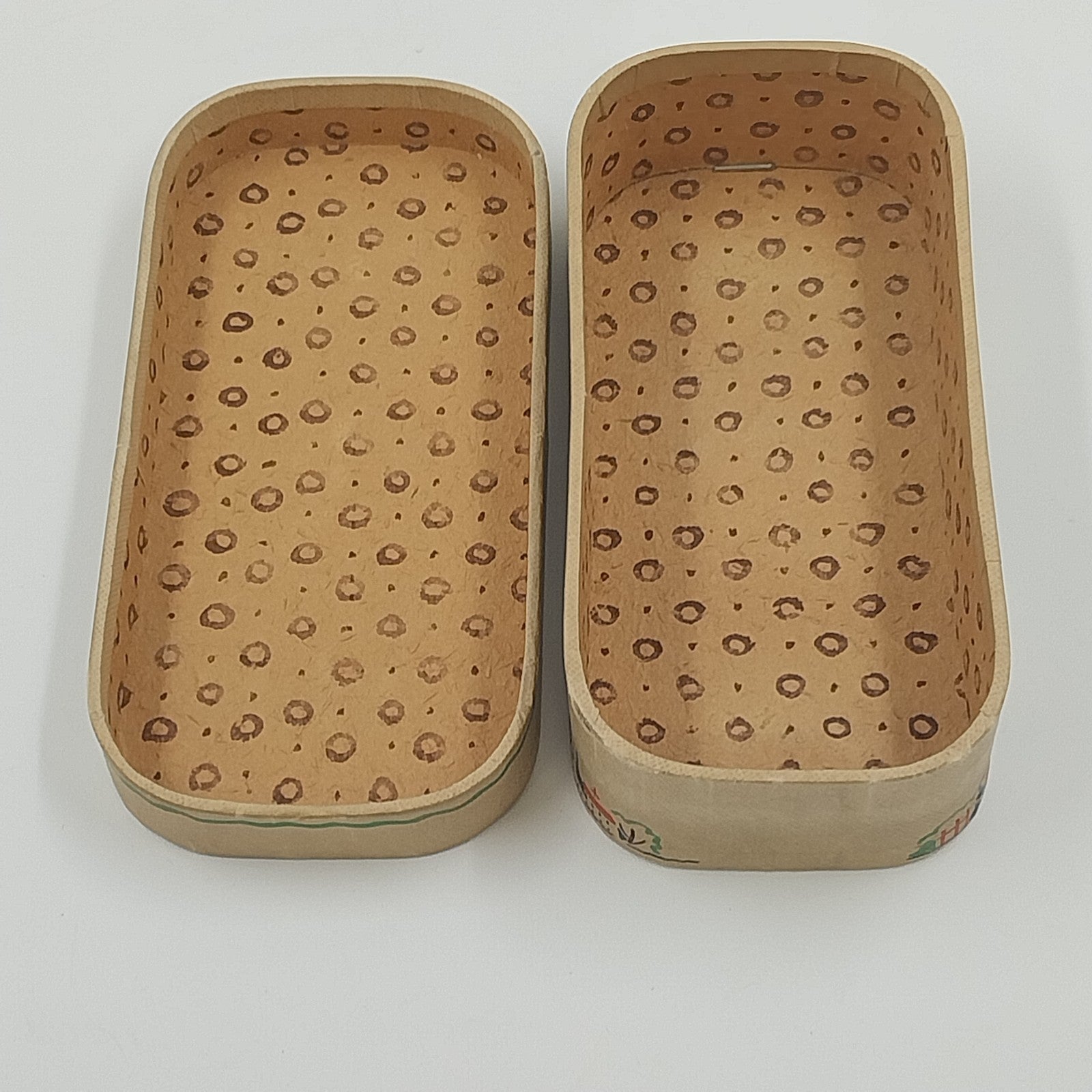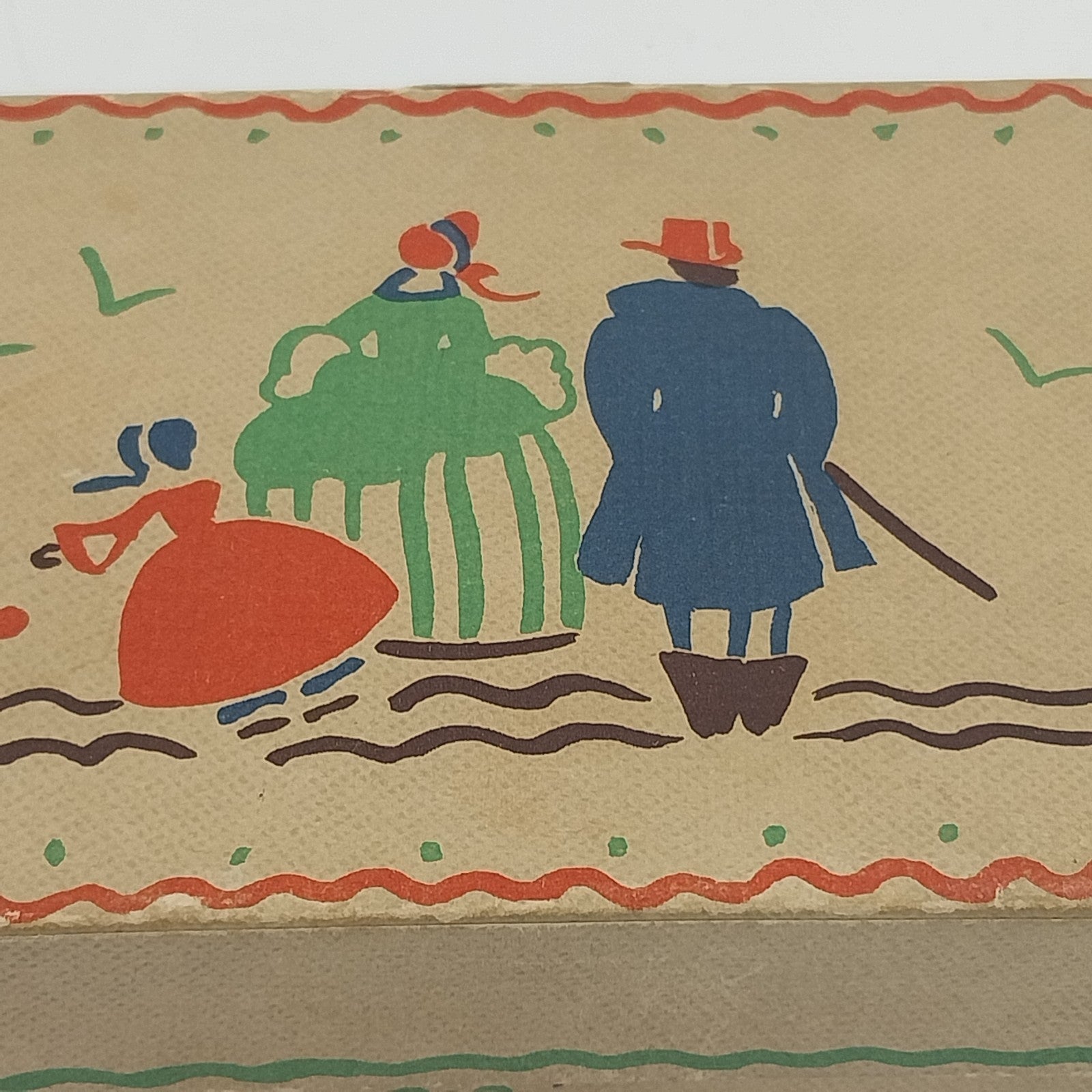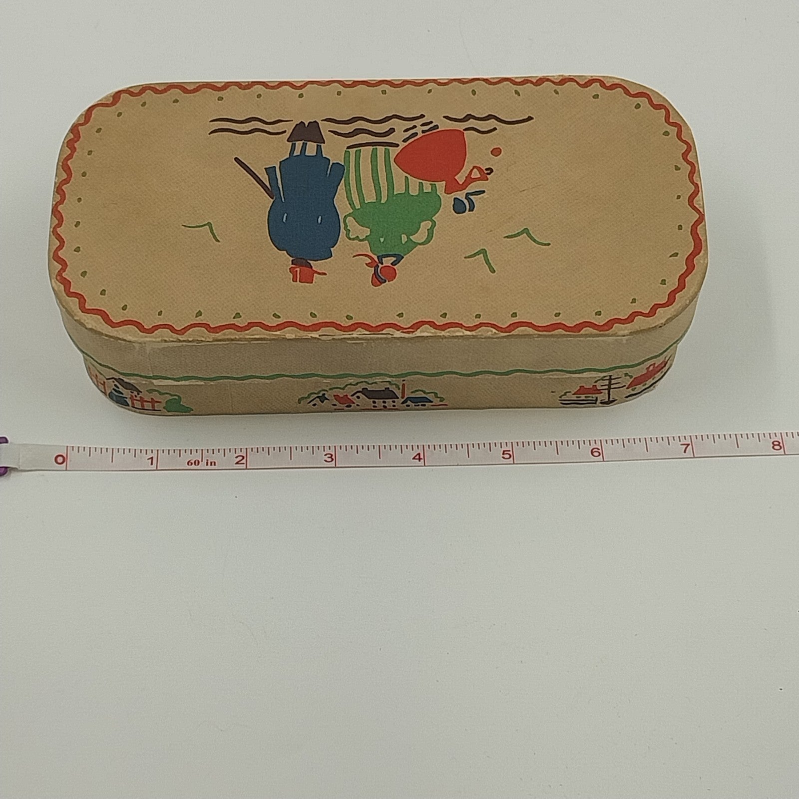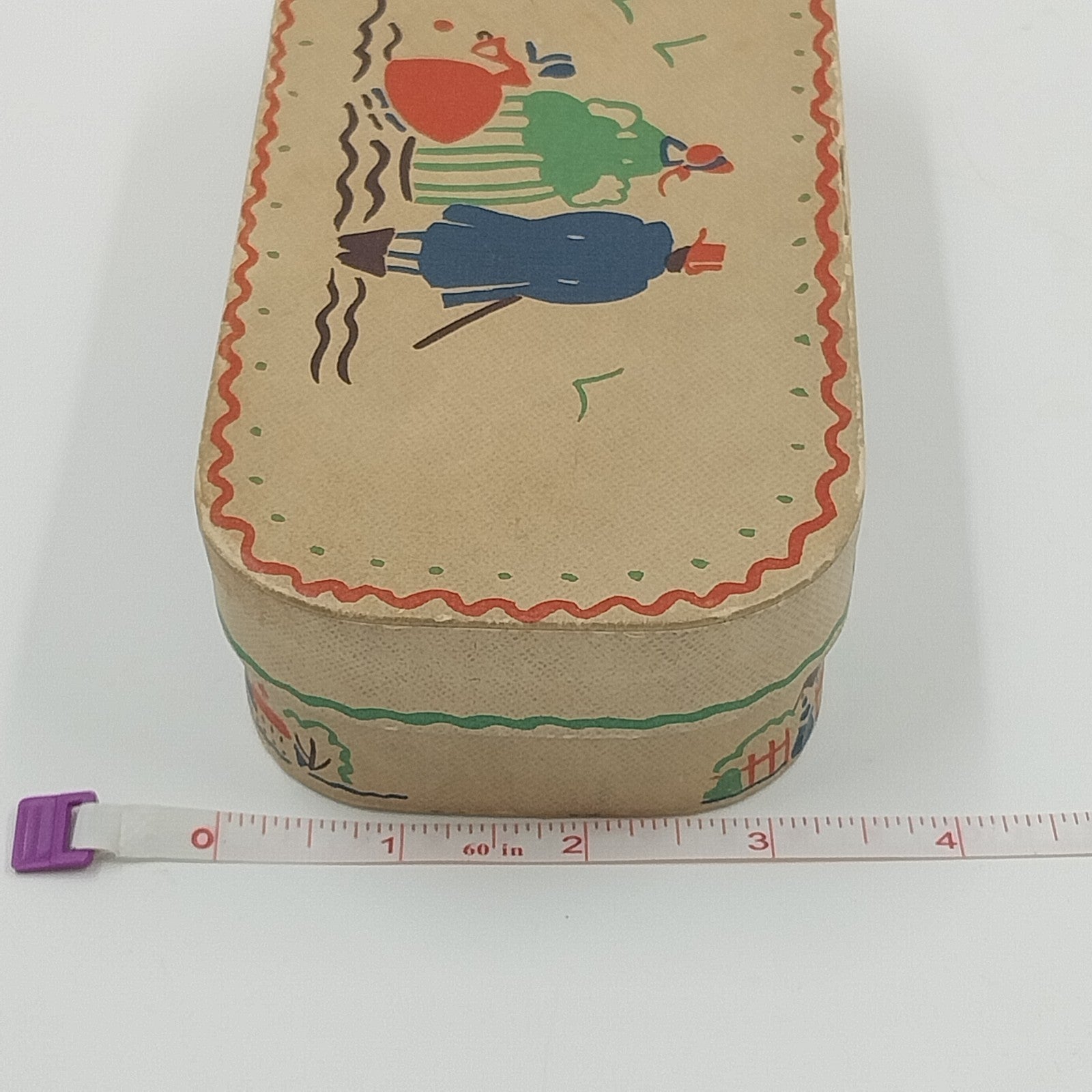 * It features a decorative design with figures in colonial attire on the lid and a village scene around the sides.