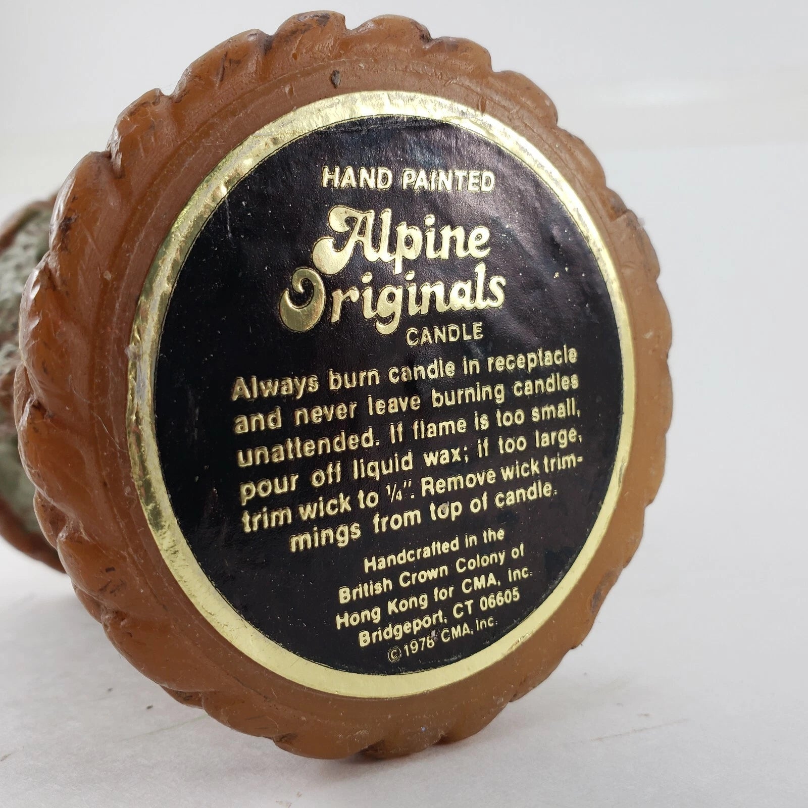 Pair of vintage 1978 Alpine Originals pillar candles with charming hand-painted child and animal scenes, including a child with a dog and a child with a doll and lamb. These collectible candles remain unused and retain their original labels. Paint shows wear from age and storage, adding authentic vintage charm. A wonderful addition to candle collections, nostalgic décor, or folk-style displays.