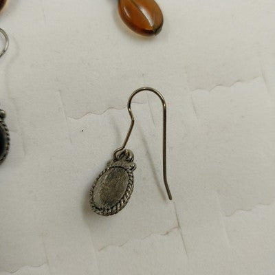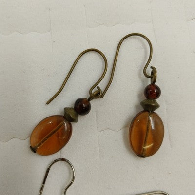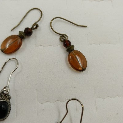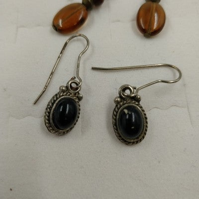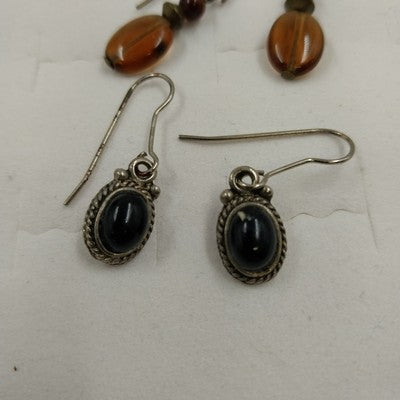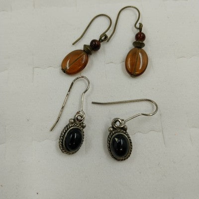 2 Dangle Earrings Silver Onyx Lever & Bronze Amber Bead Hook Set Vintage