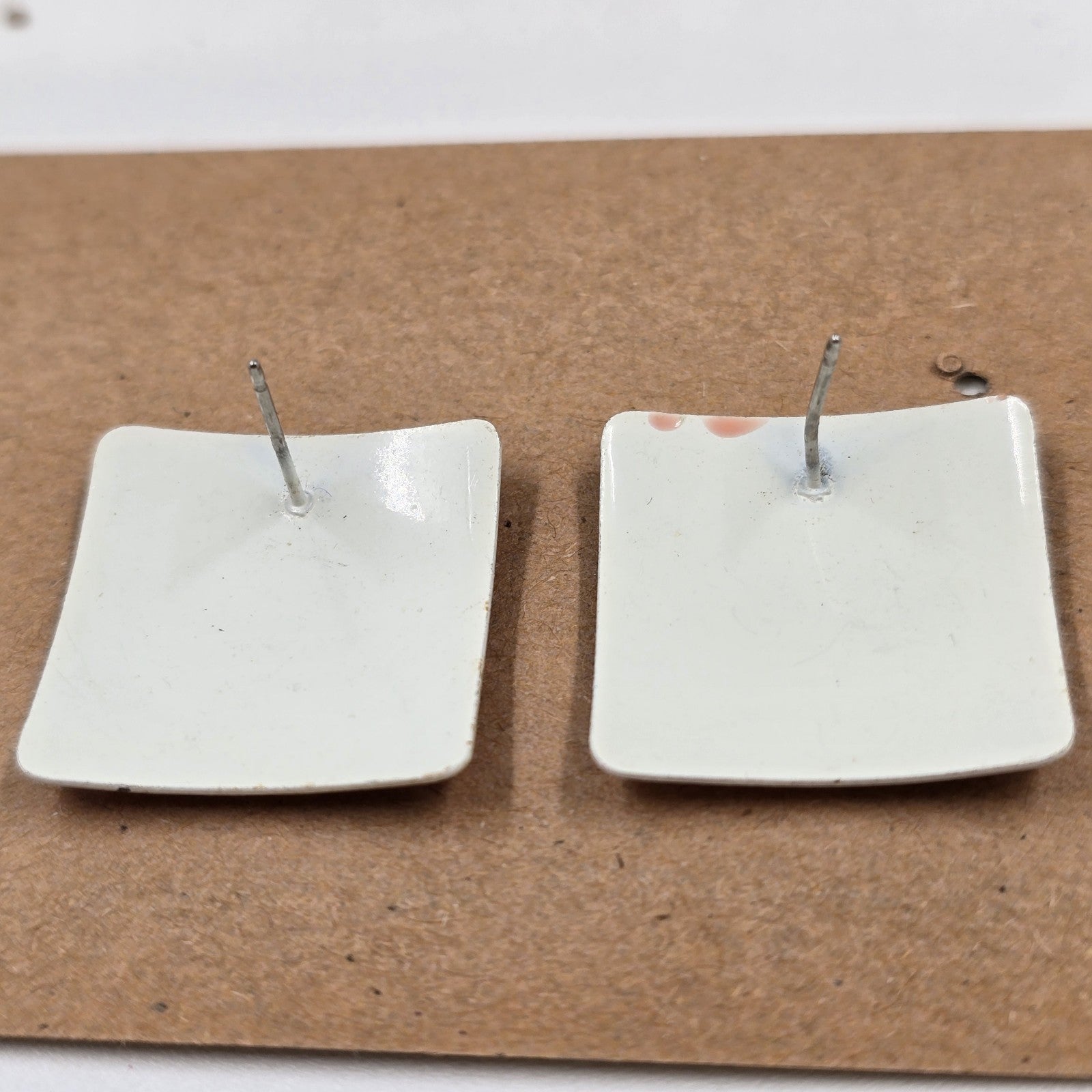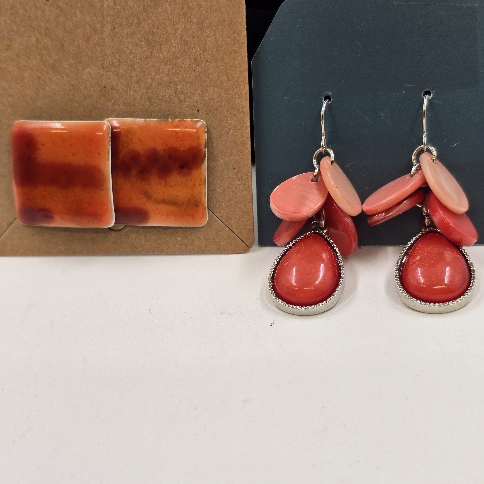 * Pair 1: Coral-colored resin square earrings with a sleek and modern design. These earrings feature a push-back closure for secure and easy wear. Approximate size: 0.75 inches.