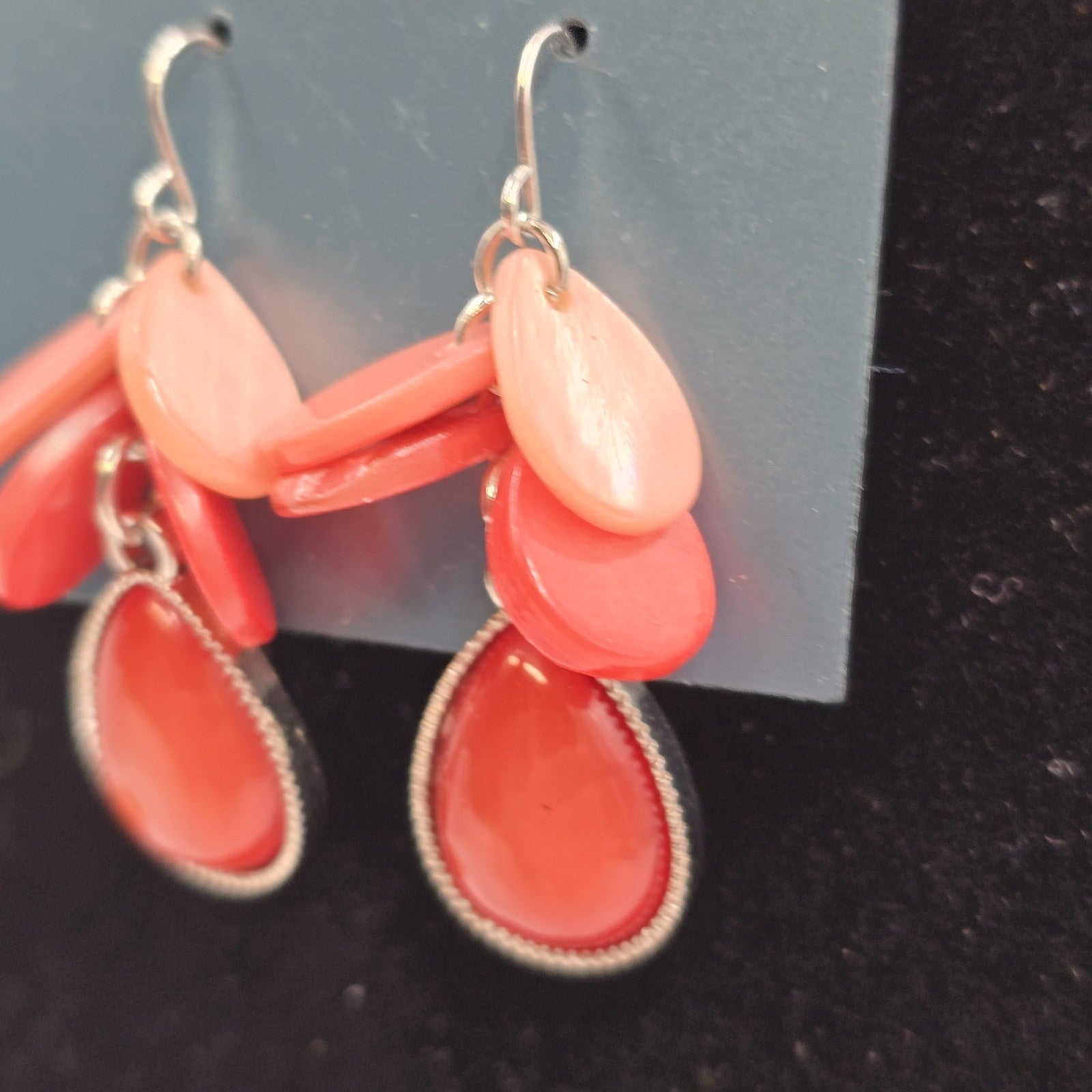 2 Sets Earrings Coral Pink Resin Square Silver Tone Red Oval Plastic Bead Dangle