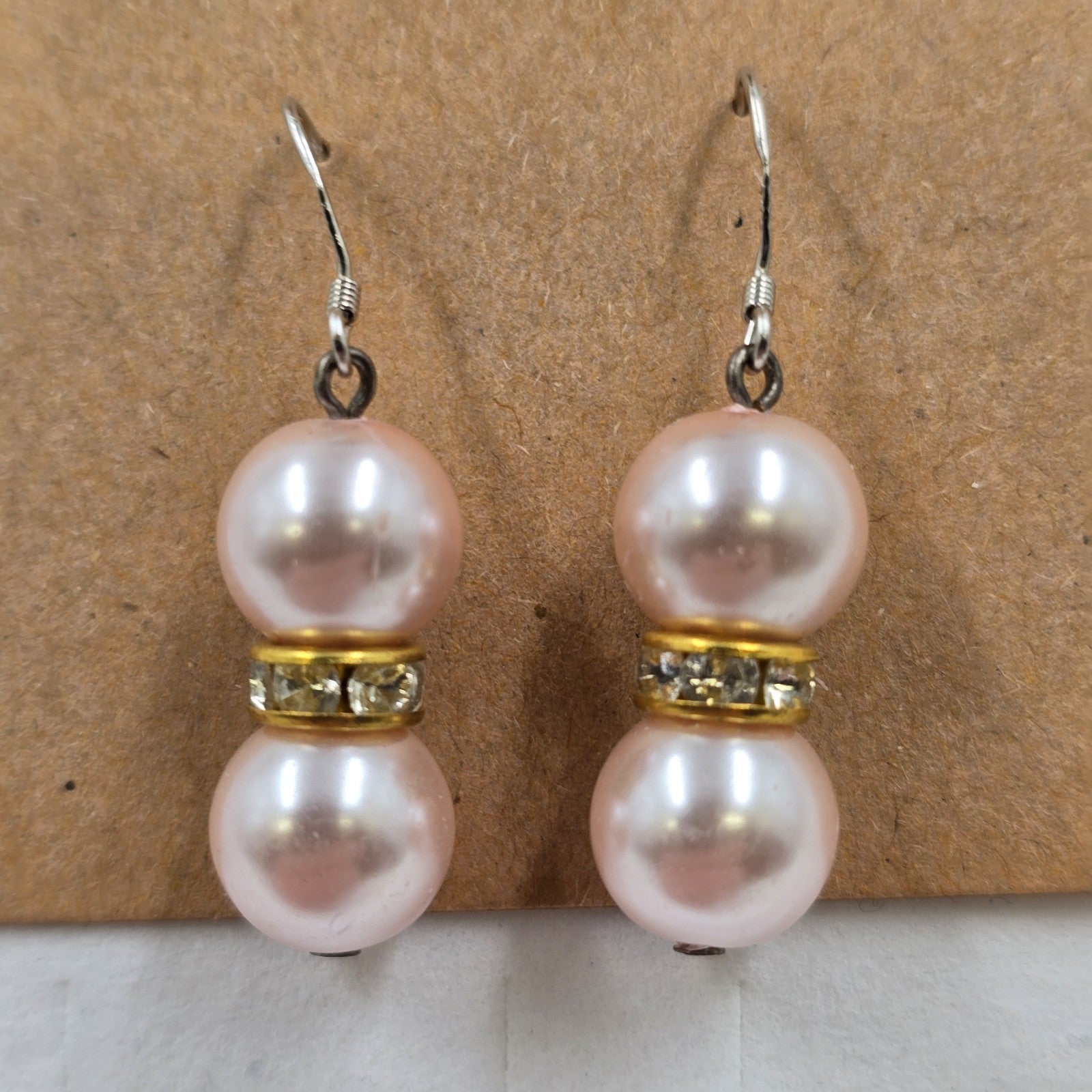 2 Earrings Pale Pink Faux Pearl with Rhinestone & Silver Tone Ball Drop Dangle