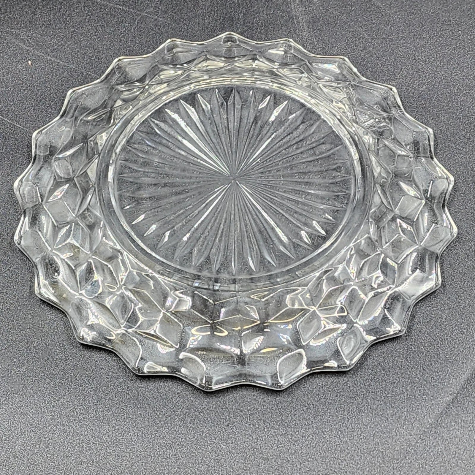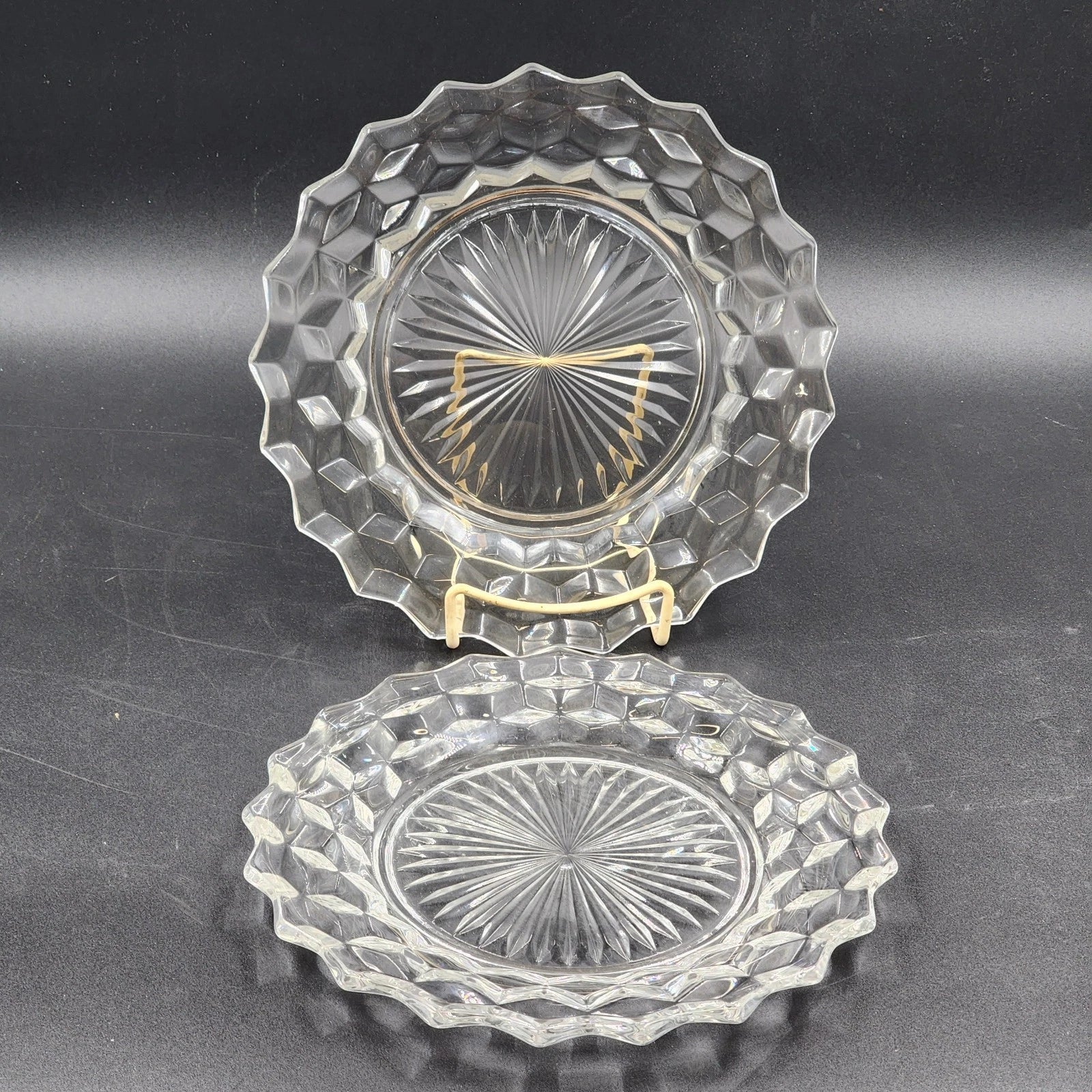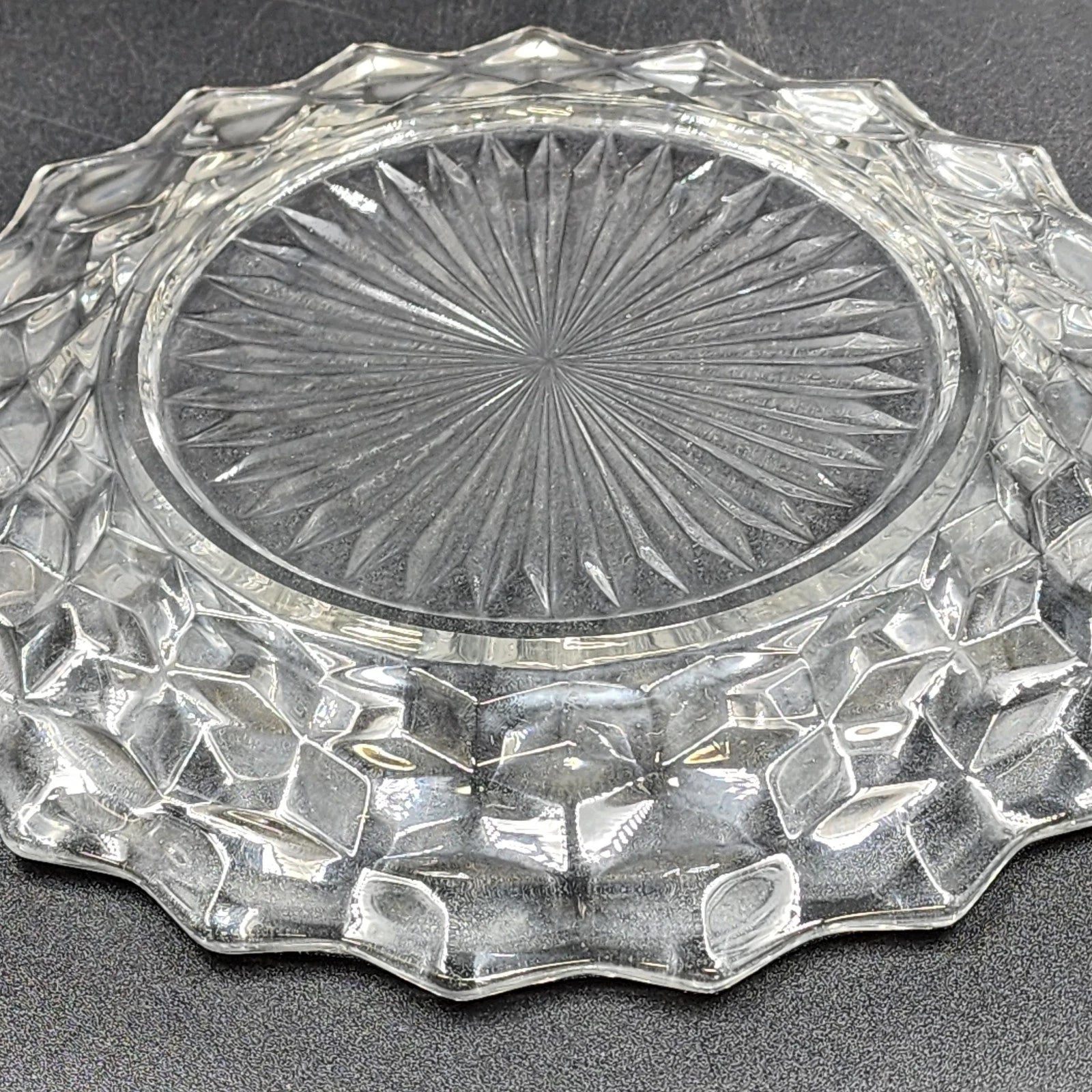 Each plate is crafted from clear pressed glass, featuring a geometric cube motif that beautifully catches and reflects light. Ideal for serving, display, or adding a touch of vintage charm to your dining collection.