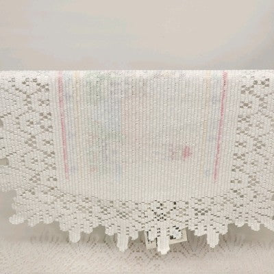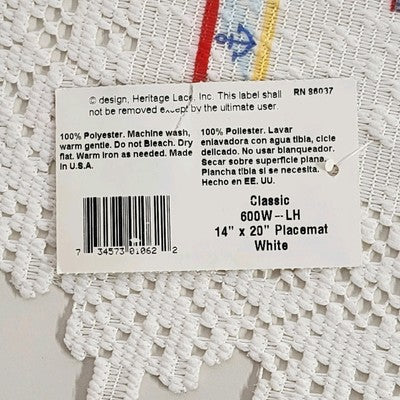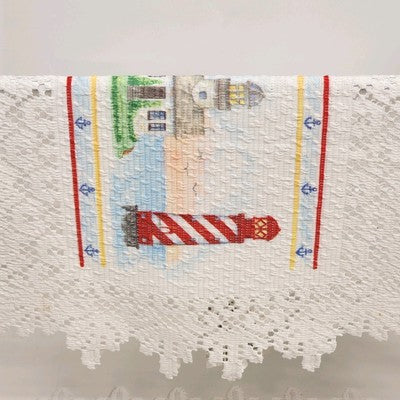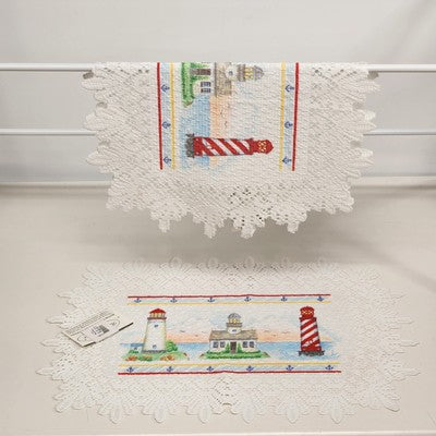 Bring coastal charm to your table with this set of 2 white Heritage Lace placemats featuring a colorful nautical lighthouse scene. Made of 100% polyester, these placemats are durable, machine washable, and come unused with the original tag.