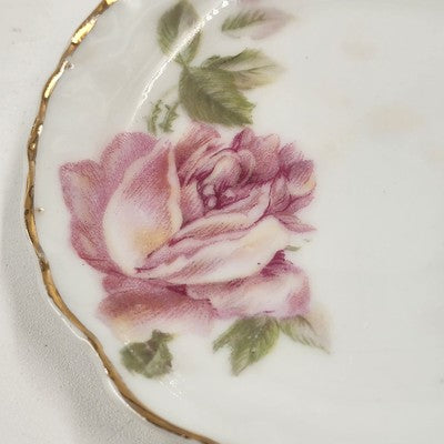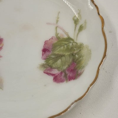 Add a touch of timeless elegance to your serveware collection with this set of two antique butter pat dishes from Rosenthal's R.C. Monbijou collection. Crafted in the early 1900s in Bavaria, these bone china dishes feature a Bavarian pink rose pattern and delicate gold scalloped edges, epitomizing Edwardian-era charm.
