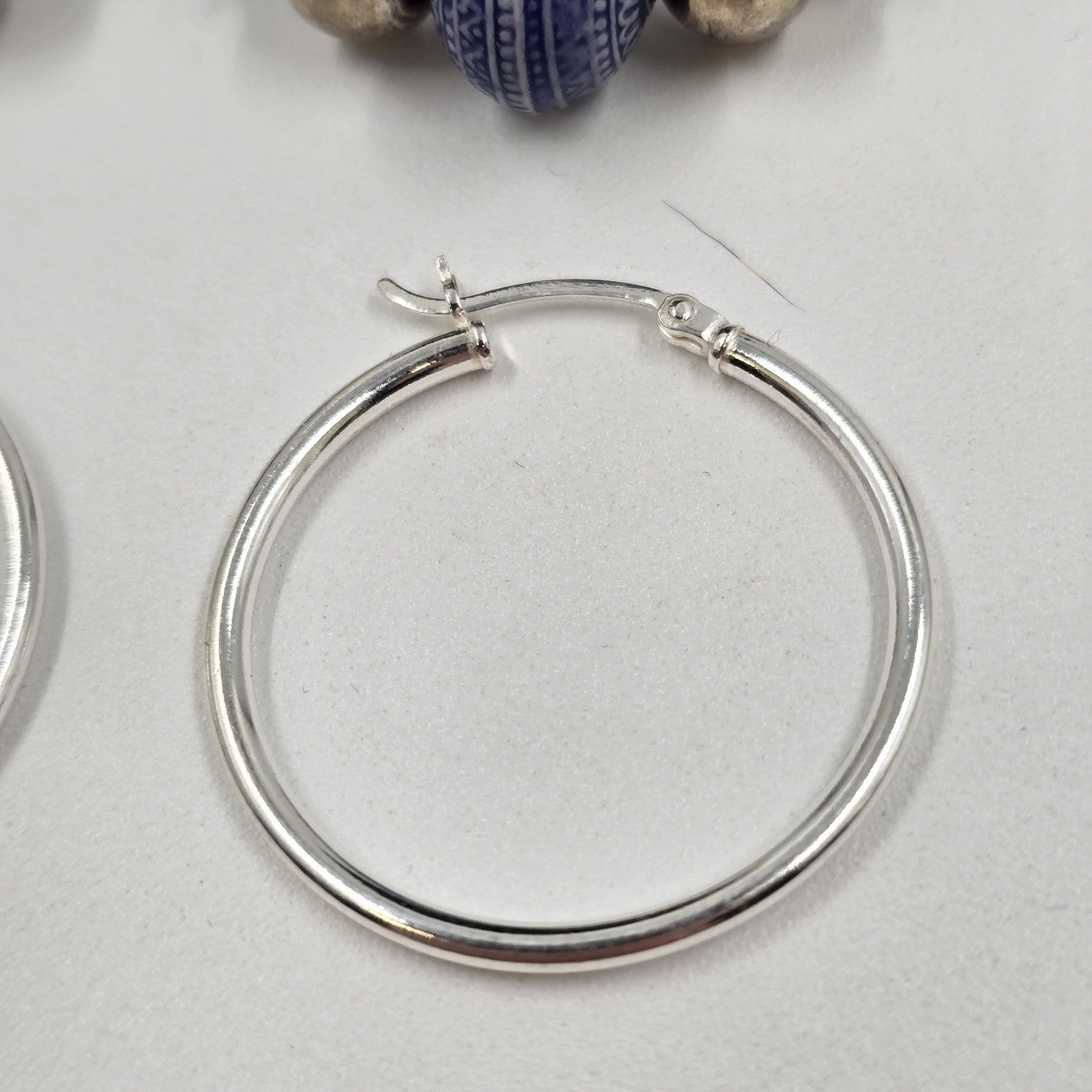 This set includes two pairs of silver-tone hoop earrings, each with a unique design. The first pair features classic plain silver-tone wire hoops, perfect for a minimalist look. The second pair showcases silver-tone hoops adorned with blue and silver-tone beads, adding a touch of floral-inspired charm. Both pairs are approximately 1.25 inches in diameter, making them versatile accessories for any occasion.
