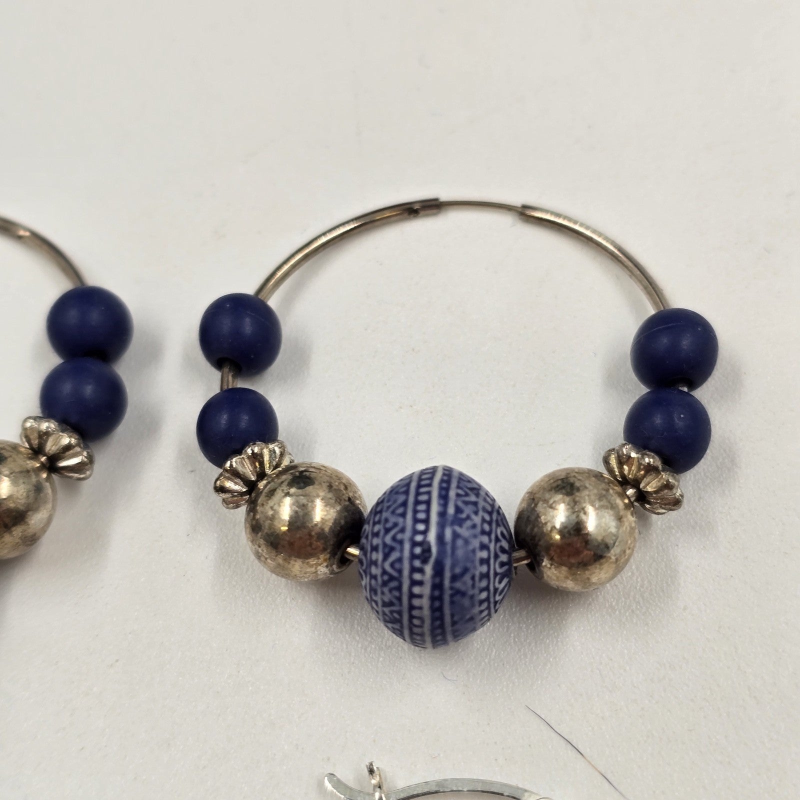 2 Set of Earrings Silver Tone Wire Hoop & Silver Tone w/ Blue Beads Floral 1.25"