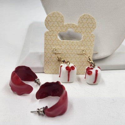 Set 2 White Red Disney Gift Box & Deep Red Wide Hoop Wavy Stud & Drop Earrings