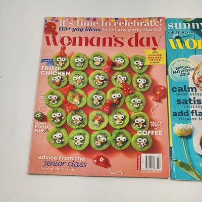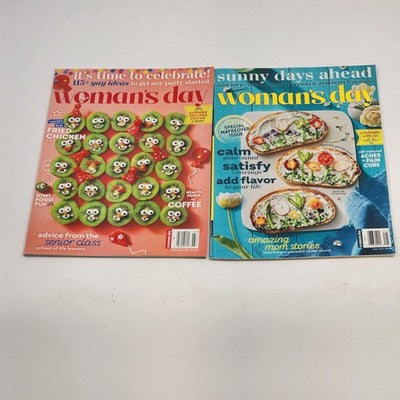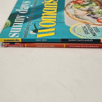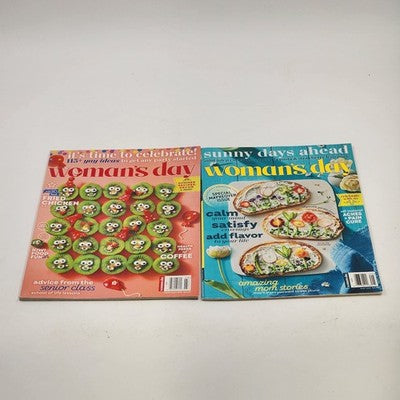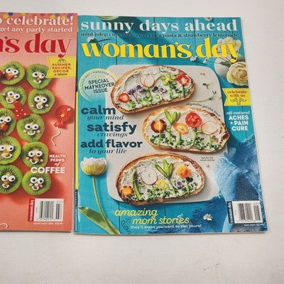 This lot includes 2 Woman's Day magazines from May 2021 ("Sunny Days Ahead") and June/July 2021 ("Time to Celebrate"). Woman's Day is a trusted lifestyle magazine featuring home décor, recipes, health tips, and everyday inspiration.