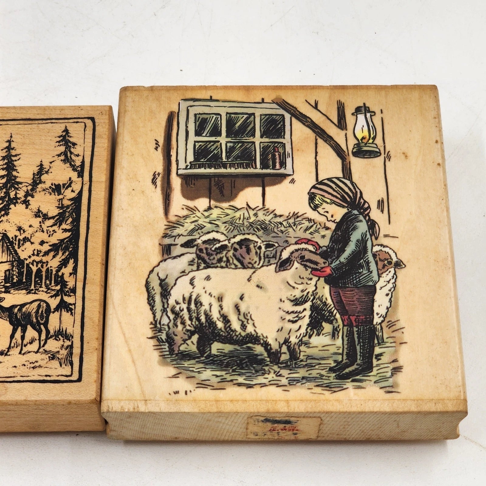2 Wood Mounted Rubber Stamps Mountain Landscape & Barnyard Sheep Scene USA