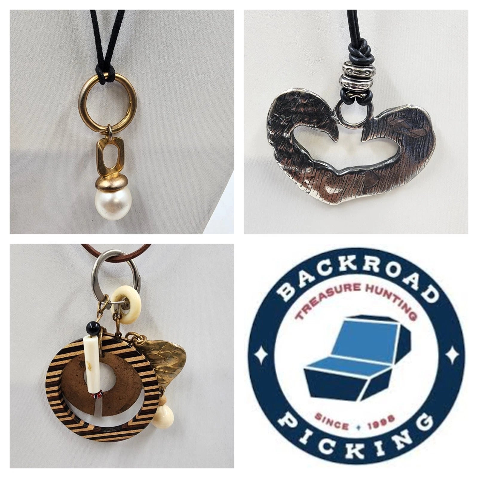 This lot of 3 corded pendant necklaces features unique and stylish designs, each with an adjustable tie closure for a customizable fit. Perfect for layering or everyday wear.
