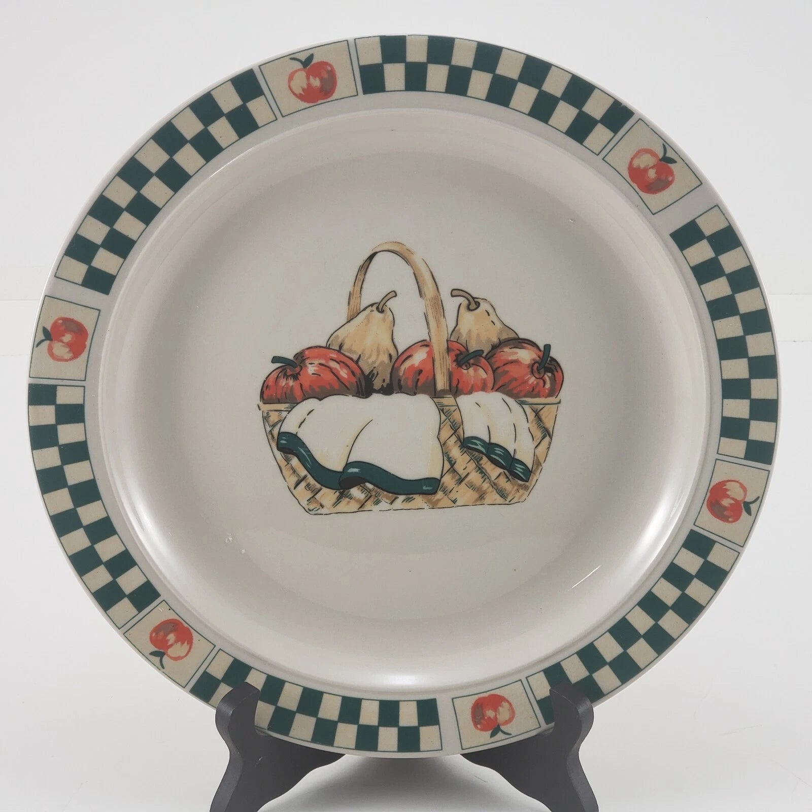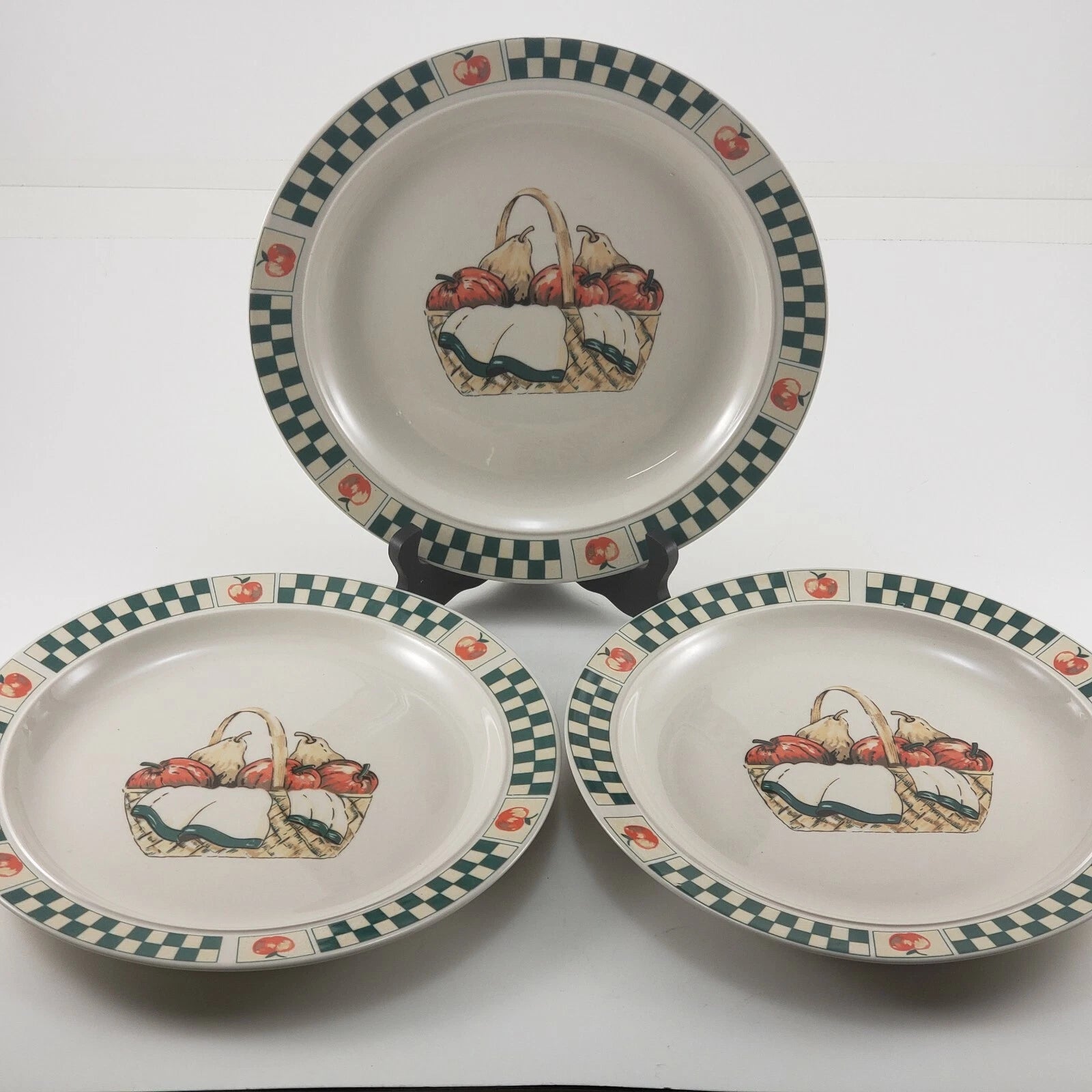 Set of 3 vintage Gibson "Welcome Home" stoneware dinner plates featuring a charming fruit basket design with apples and pears. The plates have a green check rim and warm farmhouse style. Durable and functional, perfect for everyday dining or display. Microwave, dishwasher, and oven safe.