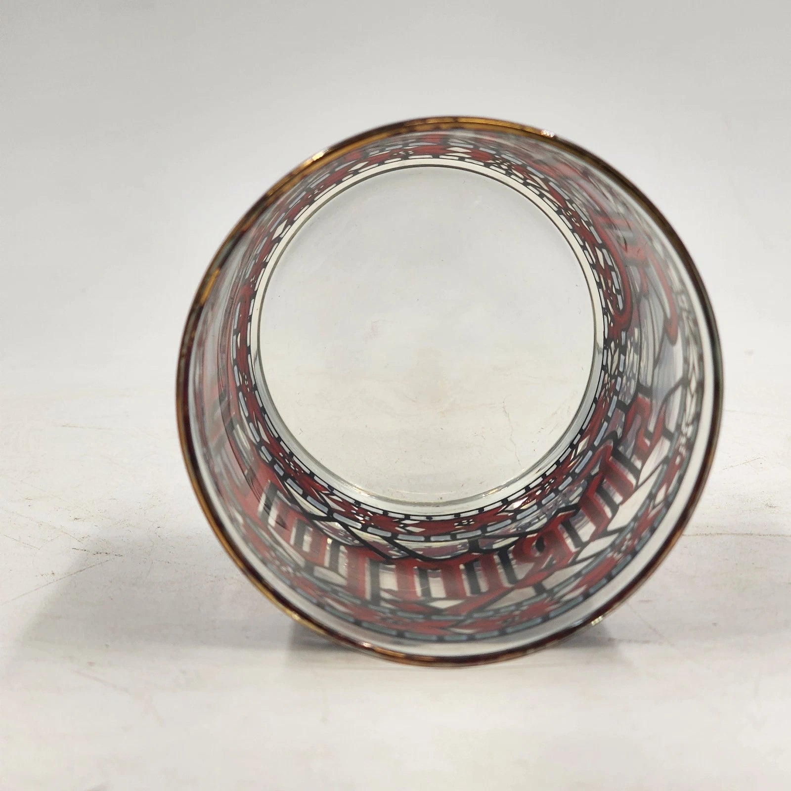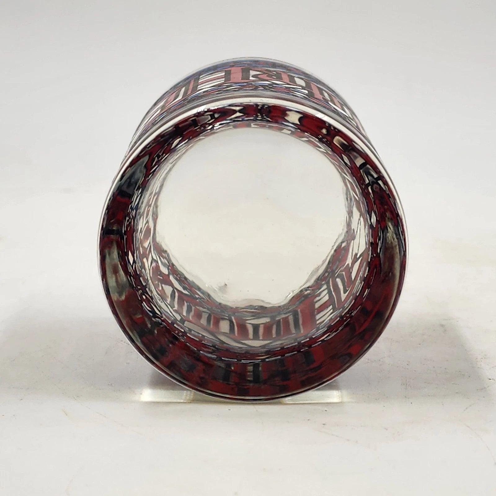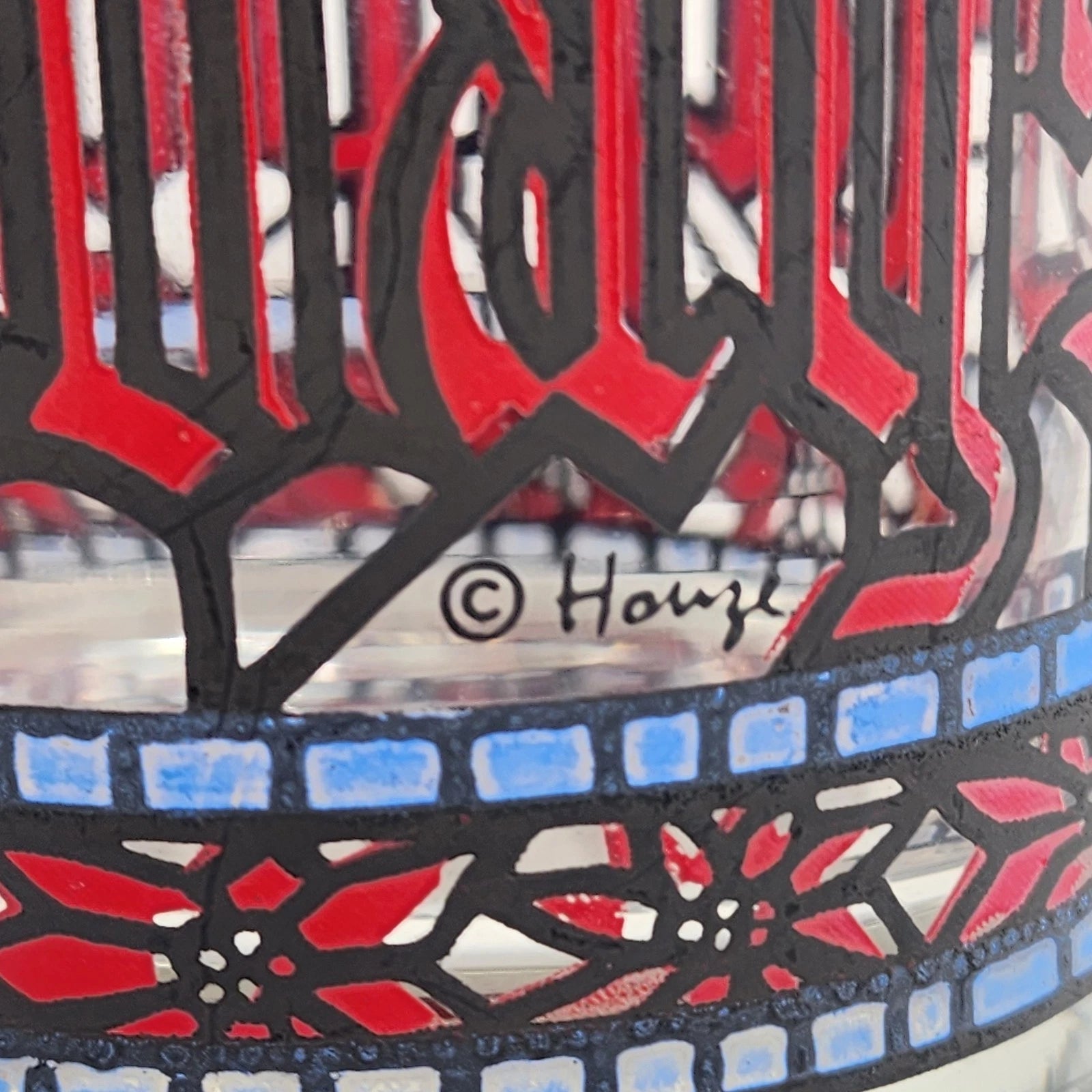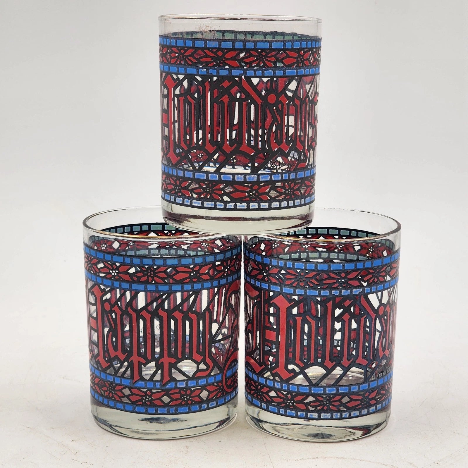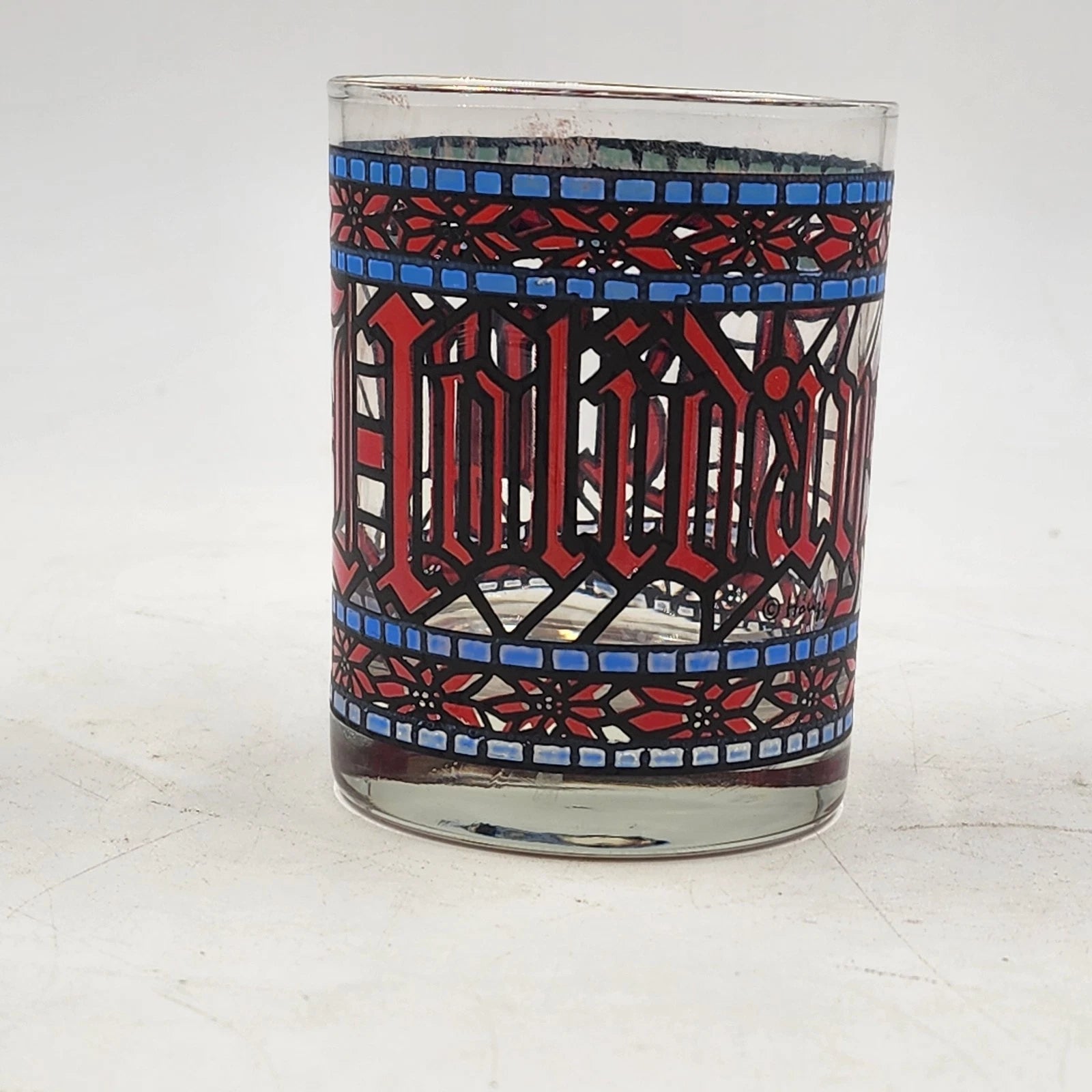 This is a festive set of three (3) vintage Houze "Happy Holidays" Stained Glass Tumblers, perfect for adding Mid-Century Modern (MCM) charm to your holiday barware collection. These double old-fashioned (DOF) glasses feature a beautiful stained-glass motif in vibrant red, blue, and gold colors, manufactured by the Houze Glass Company, likely in the 1970s.
