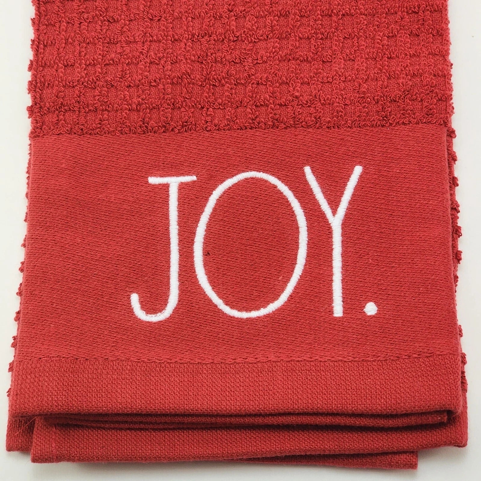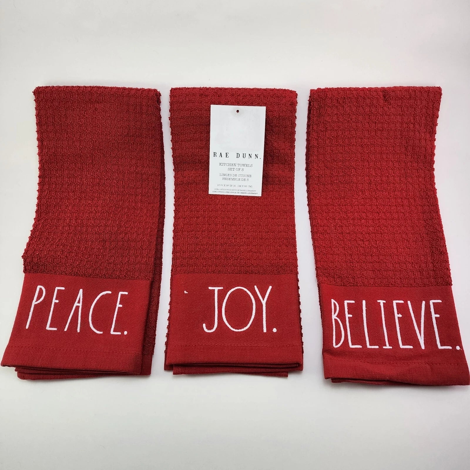 3 Rae Dunn Christmas Red Kitchen Towel Embroidered Peace Joy Believe 100% Cotton