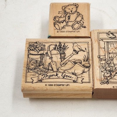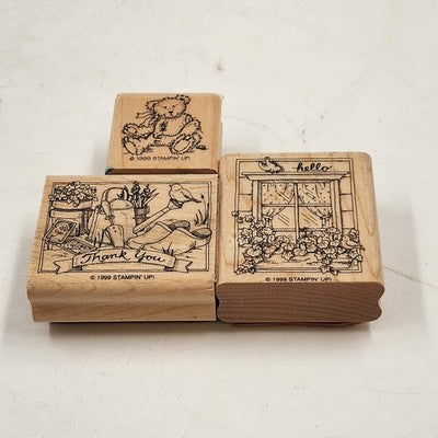 This set of 3 wood-mounted rubber stamps by Stampin' Up! (1999) features a fun greeting theme including Bear, Thank You, and Hello designs. Perfect for cardmaking, scrapbooking, journaling, and other craft projects.