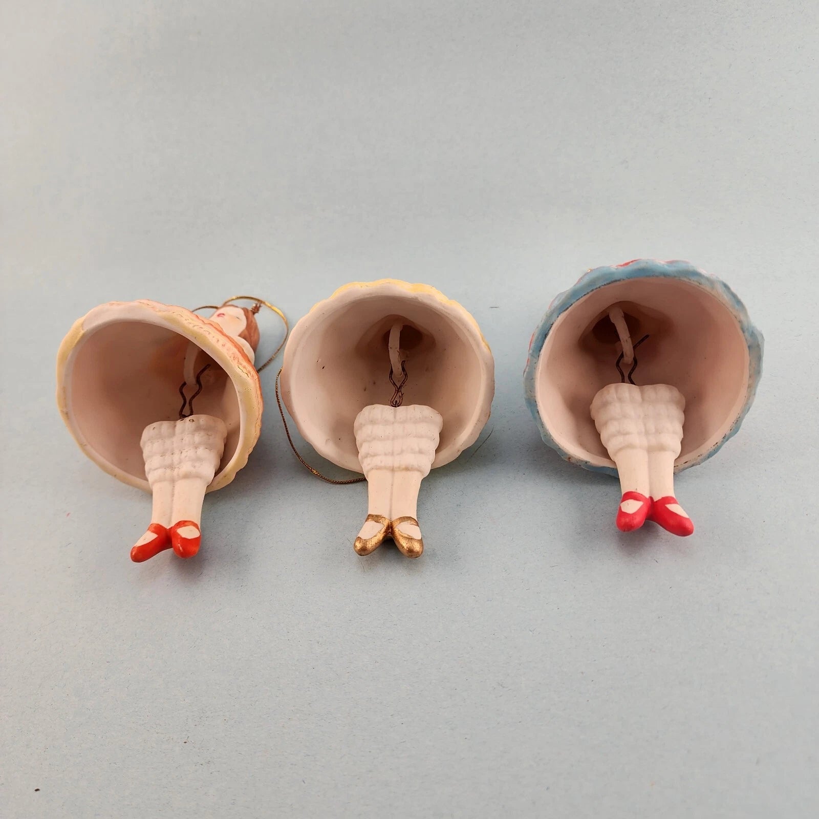 3 Young Girl Christmas Ornaments Porcelain Bell Hanging Leg Chimes w Box Vintage