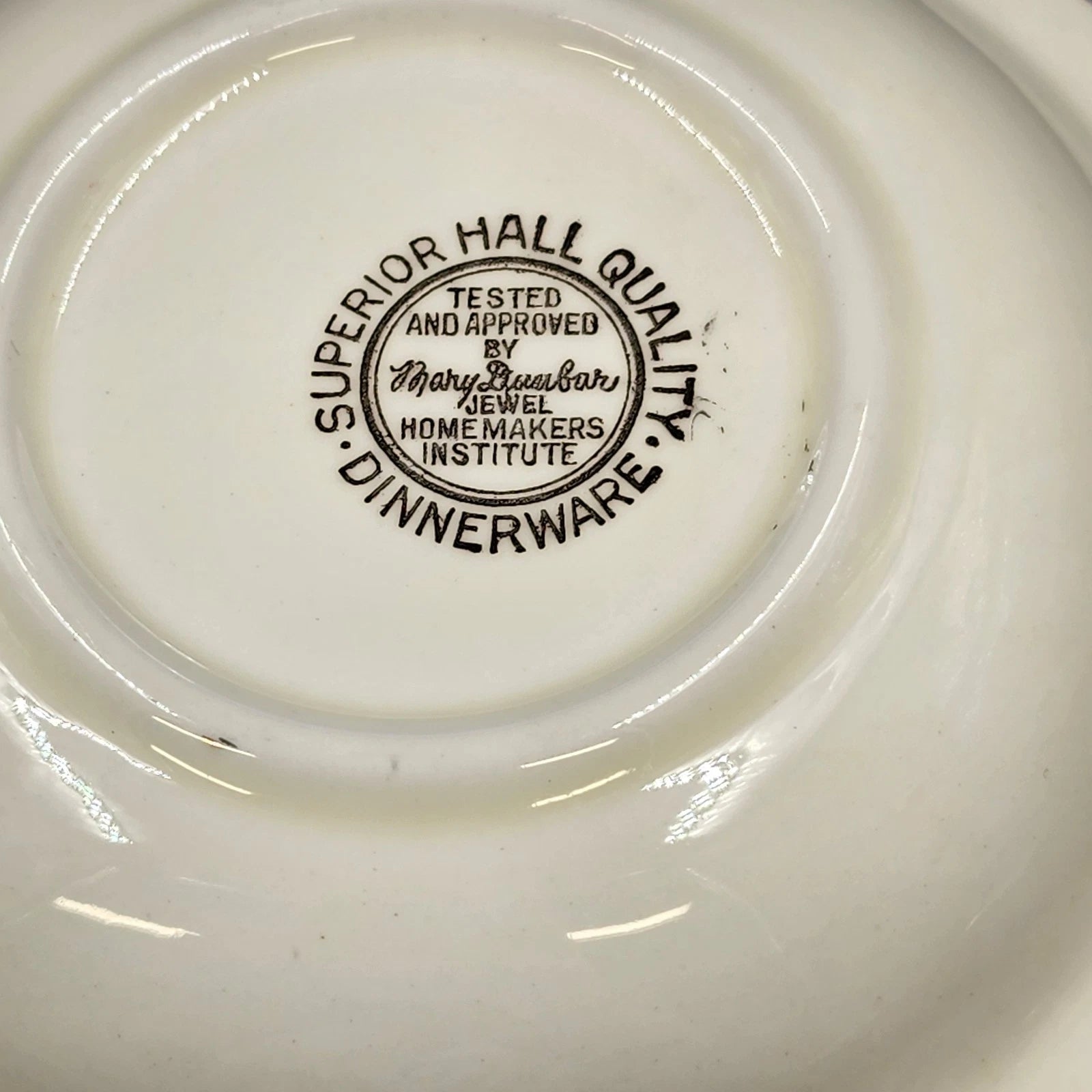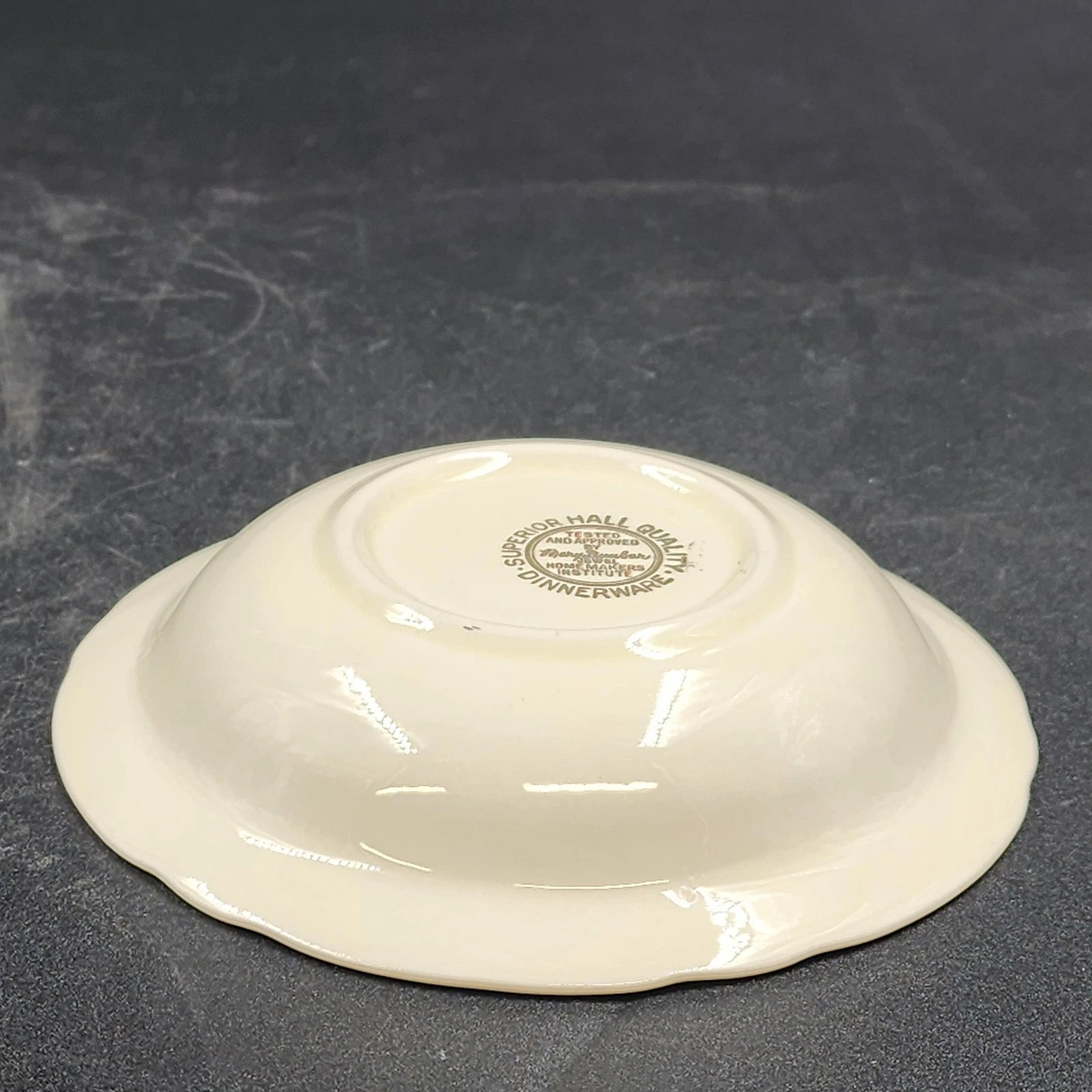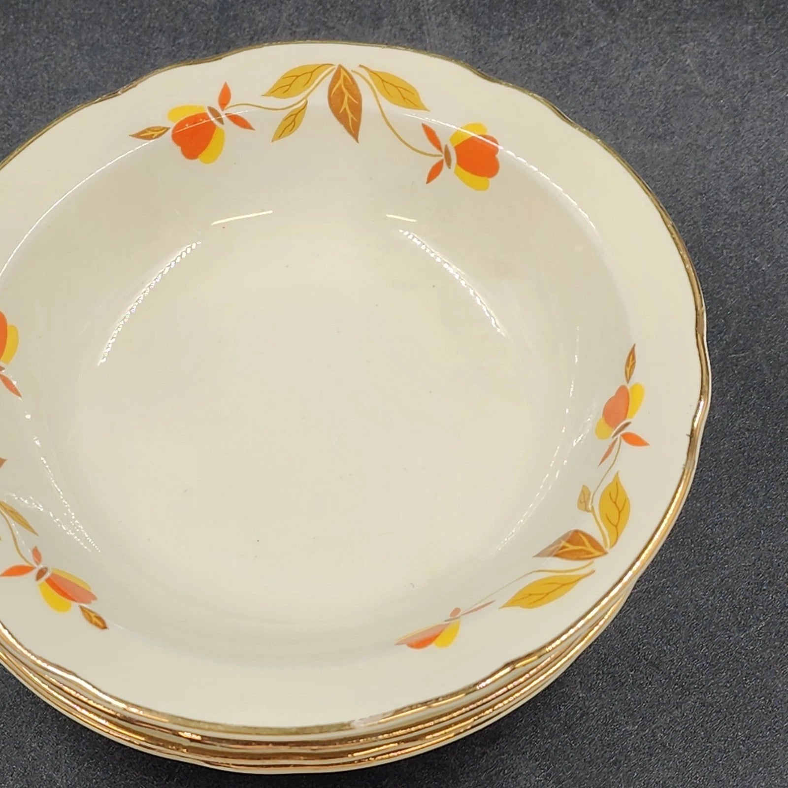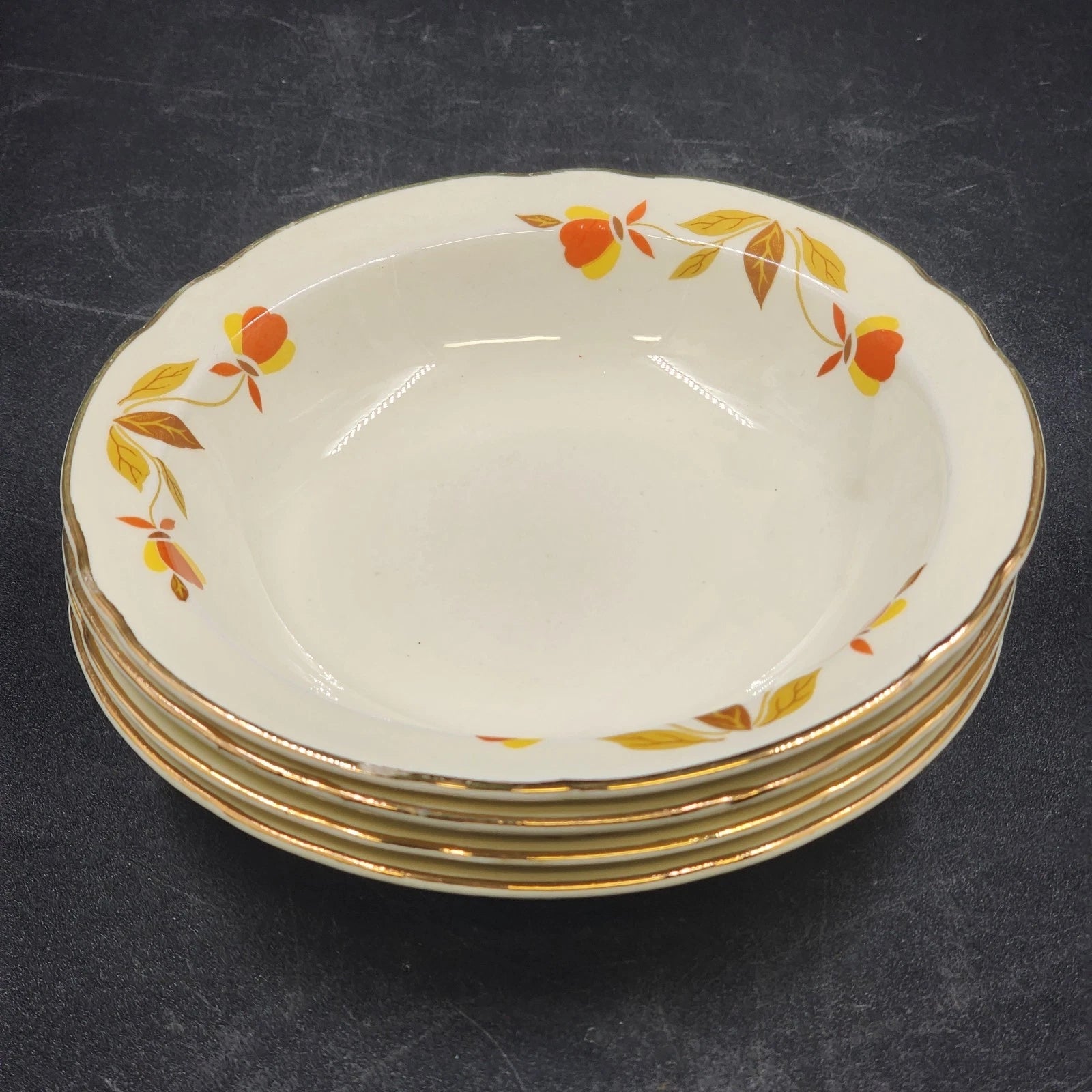 This listing is for a beautiful set of four (4) vintage Autumn Leaf Rimmed Fruit/Dessert Bowls, essential pieces for any complete service set from this classic line distributed by the Jewel Tea Company. Manufactured by the Hall China Company between 1933 and 1976, these small bowls are perfect for serving fruit, ice cream, or side dishes.