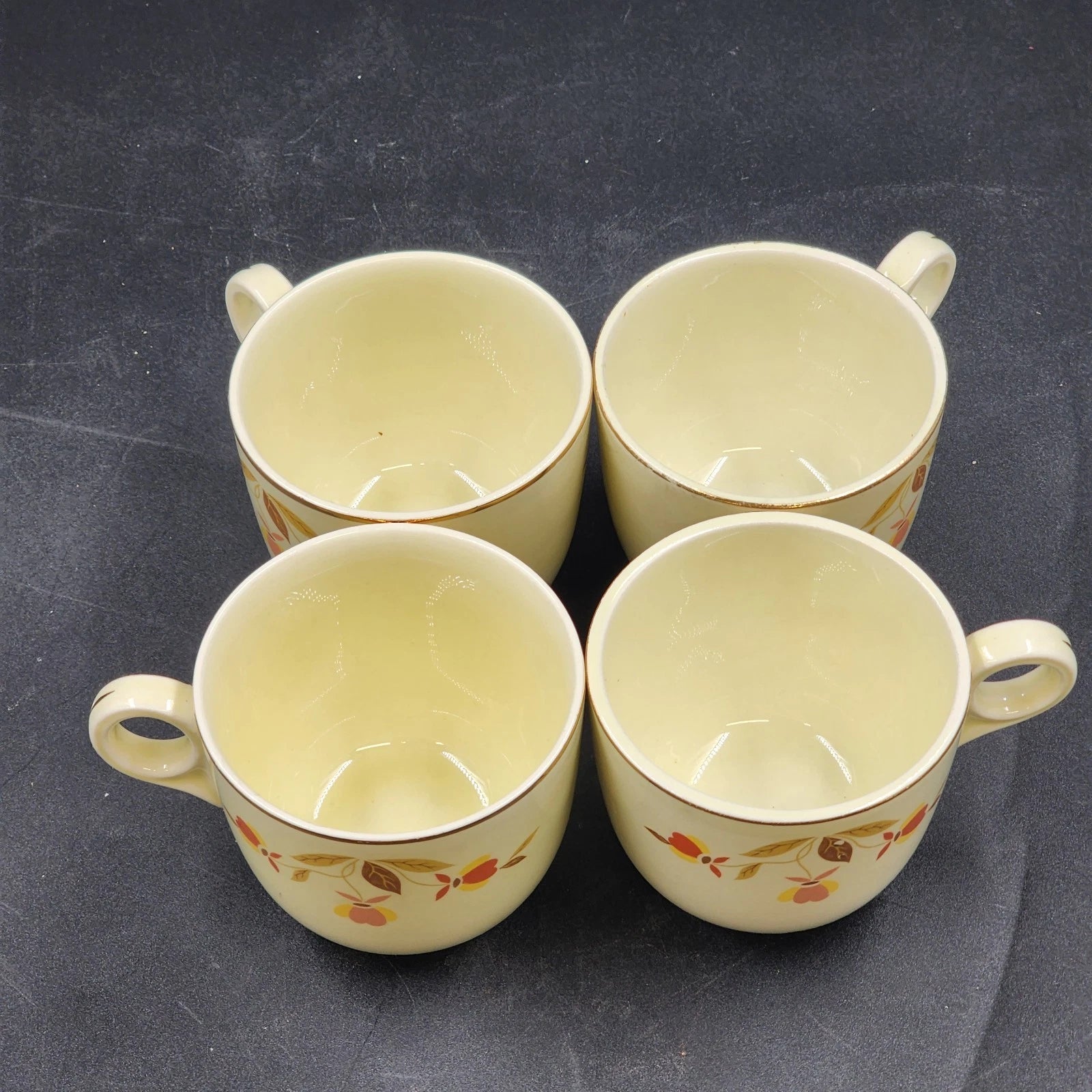 This listing is for a beautiful set of four (4) vintage Autumn Leaf St. Denis Cups, essential items for any collector of this classic pattern distributed by the Jewel Tea Company. Manufactured by the Hall China Company between 1933 and 1976, these cups feature the signature beige/ivory background, the decal of autumn-colored leaves, and elegant gold trim around the rim.