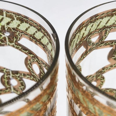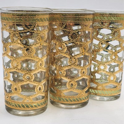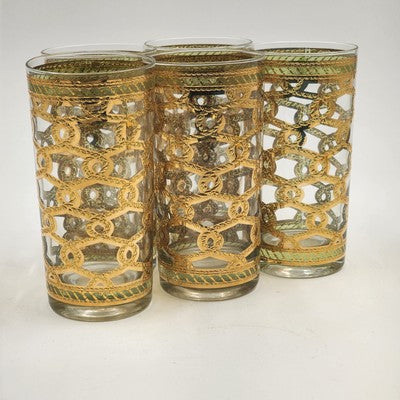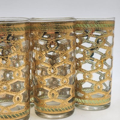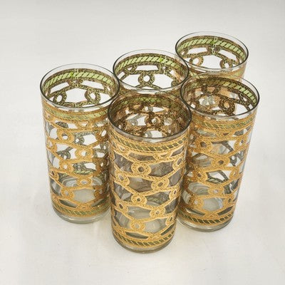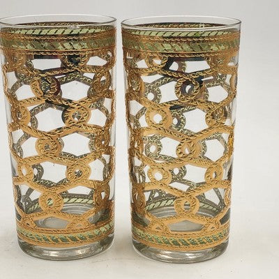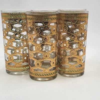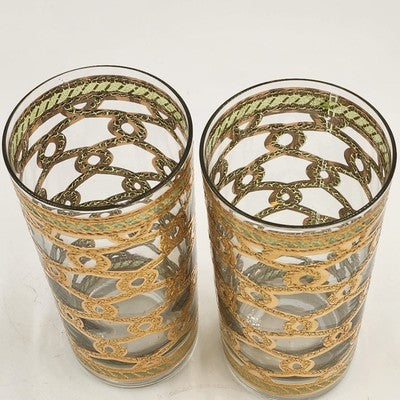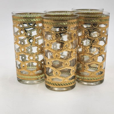 Add a touch of vintage sophistication to your glassware collection with this set of 4 Culver highball tumblers. Each glass features the iconic entwined rope design, accented with 22-karat gold and vibrant green detailing, perfect for entertaining or display.