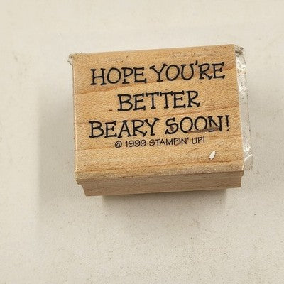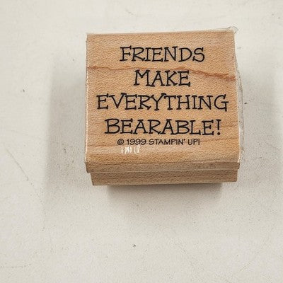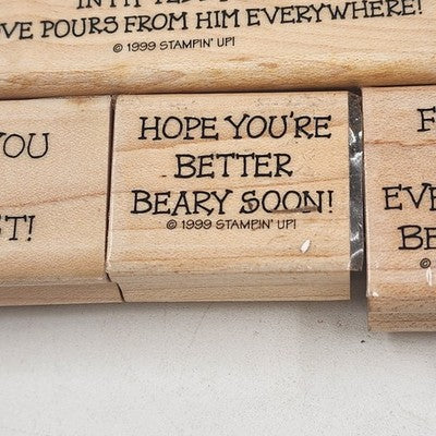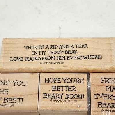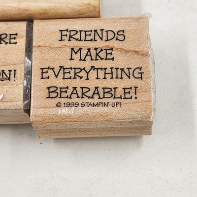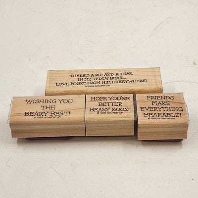 Set of 4 wood-mounted rubber stamps by Stampin' Up! (1999) featuring moral support and bear-themed designs. Great for cardmaking, scrapbooking, journaling, and DIY crafts. All stamps are clean with sturdy wooden mounts.