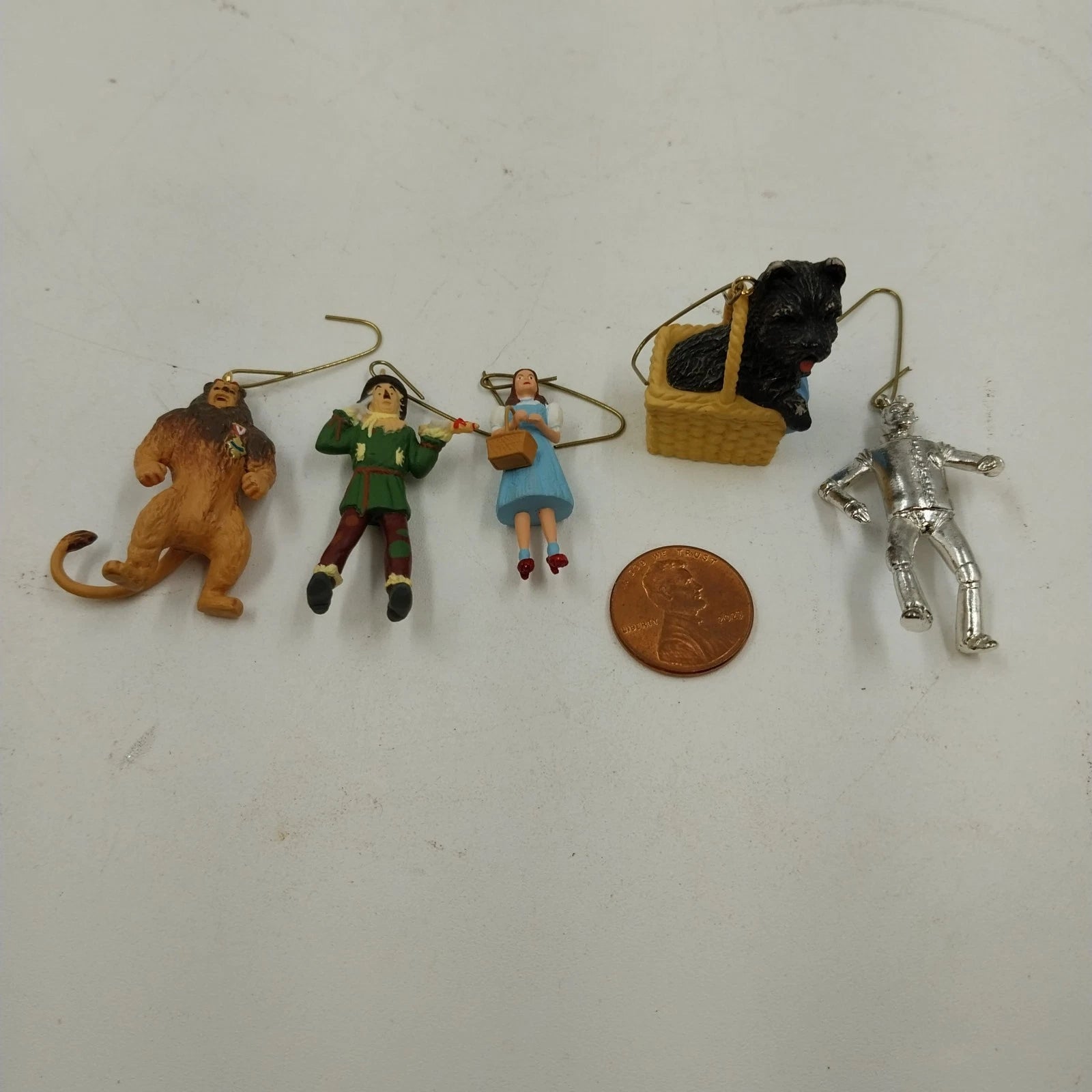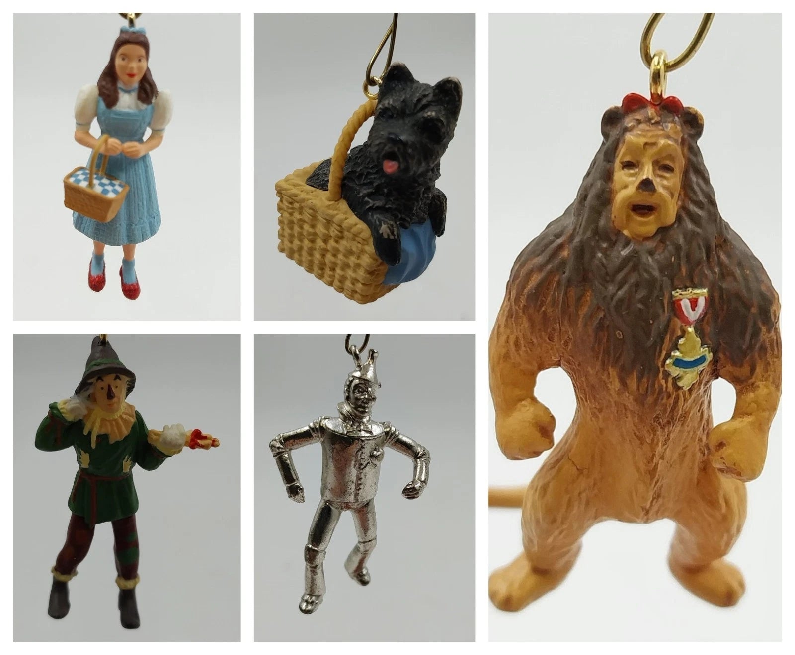 This is a set of five Hallmark Keepsake miniature ornaments from the 2000s featuring beloved characters from The Wizard of Oz. These limited edition artist-designed ornaments include Dorothy, Toto, Scarecrow, Tin Man, and Cowardly Lion. Each piece is finely detailed and perfect for Christmas tree decorating or adding to a Wizard of Oz collection.