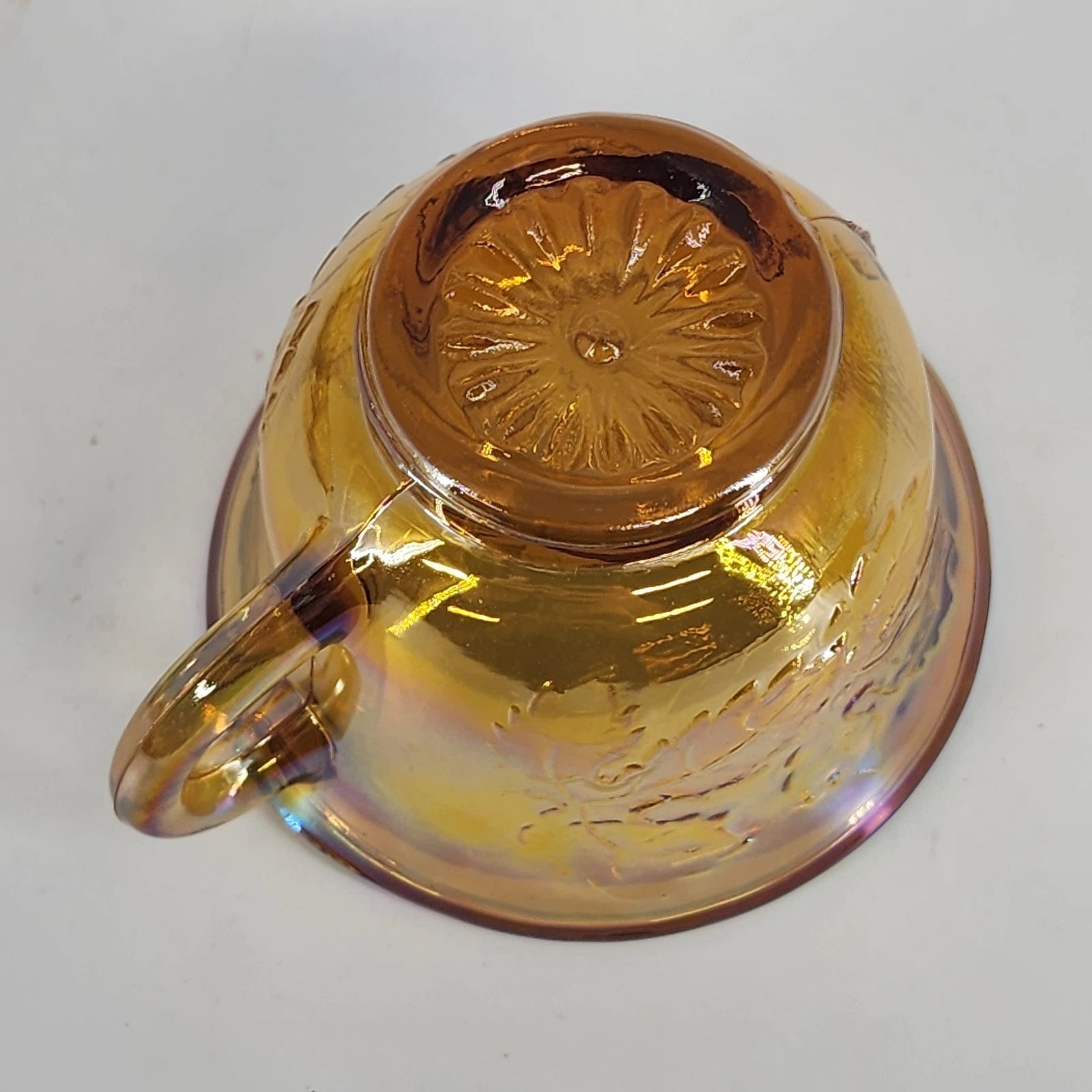 Add a glow to your next gathering with this set of four Indiana Glass Harvest Grape punch cups. Featuring a stunning marigold iridescent finish, these cups capture a beautiful spectrum of colors that shift with the light. The classic "Harvest Grape" embossed design-complete with intricate vines and fruit clusters-is a hallmark of mid-century American carnival glass. These durable, pressed-glass cups are perfect for serving holiday punch, eggnog, or cider, and they make a radiant addition to any vintage glassware collection or festive tablescape.