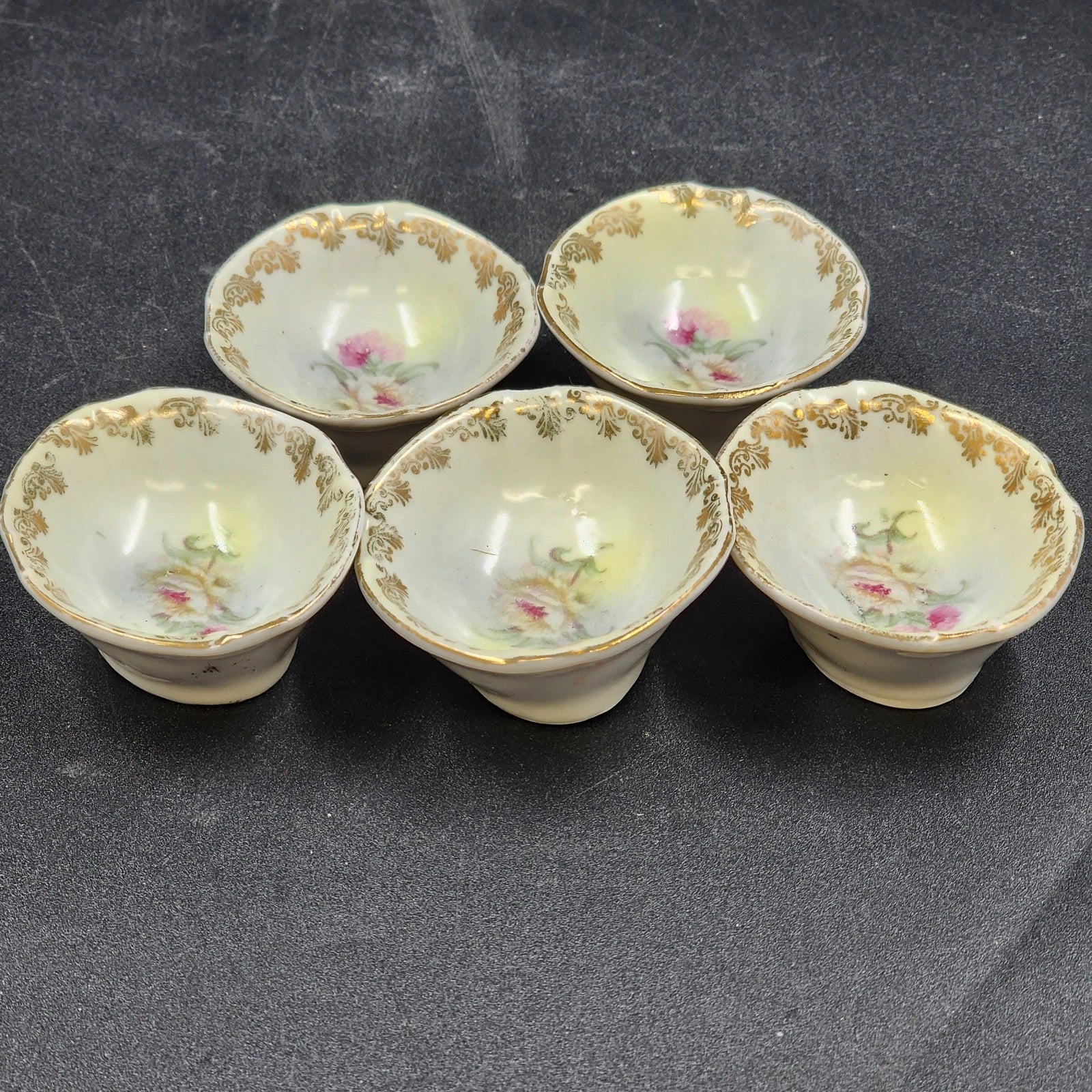 Add a touch of timeless elegance to your table setting with this set of 5 vintage Dresden Germany salt cellars or berry bowls. Each piece features a delicate floral pattern with gold gilt trim, showcasing the refined craftsmanship typical of Dresden fine china.