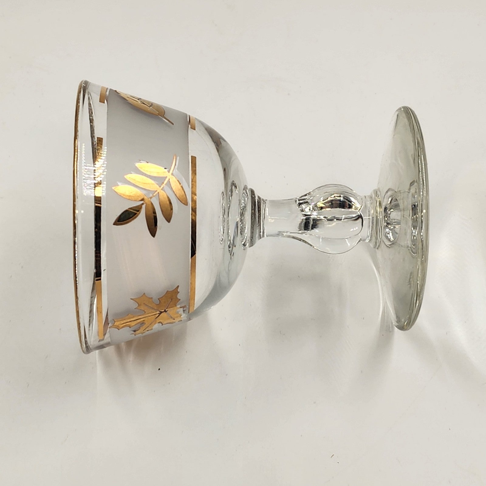 Elevate your drinkware collection with this set of six Libbey stemmed wine or sherbet glasses. Each glass stands at 4.375 inches tall and has a round shape with a 3.625 inch diameter. The glasses are made of clear, glossy glass material with a beautiful gold leaf frosted pattern that adds a touch of elegance to any occasion. These mid-century modern glasses are a limited edition and have a production style of pressed glass. The glasses are perfect for all occasions and have a capacity of 4 oz. The glasses are unisex and have a item weight of 6 oz. Hand wash only to keep them looking their best.
