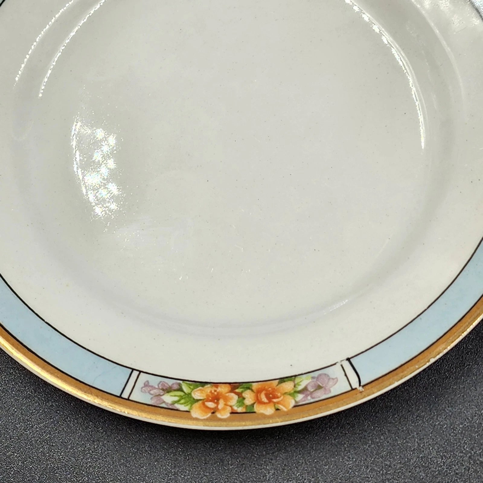 Set of 6 vintage bread and butter plates from J & G Meakin's "Nebraska Blue" pattern, part of the Sol line made in England. These charming plates feature a light blue rim, floral accents, and a gold trim, showcasing the elegant craftsmanship typical of mid-20th century English ironstone.