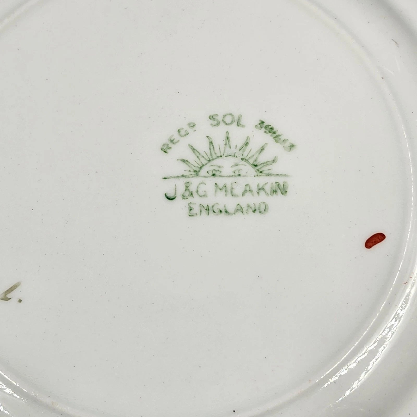 Produced in England between 1918 and 1953, these plates are part of J & G Meakin's renowned Sol 391413 line. They are perfect for serving desserts or for collectors of English fine china.