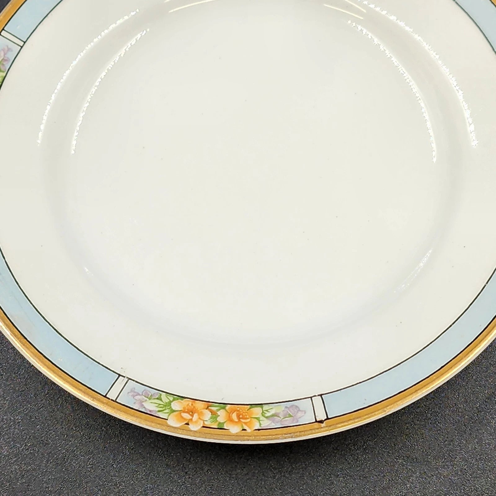 Set of 6 vintage dessert/pie plates from J & G Meakin's "Sol" line, featuring the lovely Nebraska Blue pattern. Each plate showcases a soft blue rim with delicate floral accents and a subtle gold edge, adding a touch of charm to any table setting.