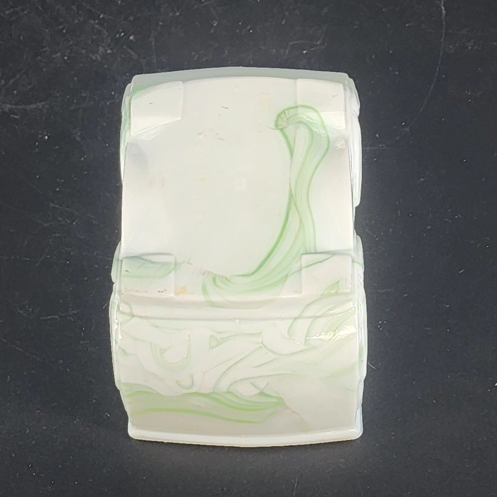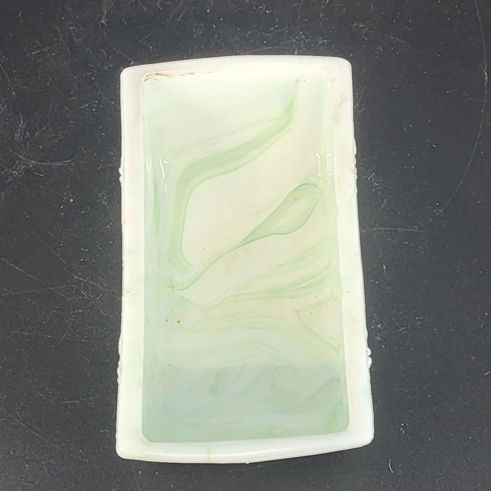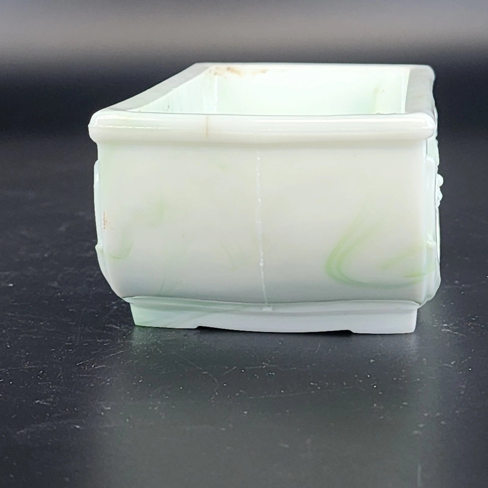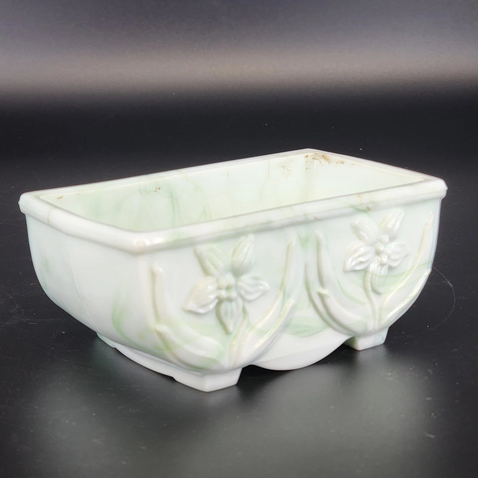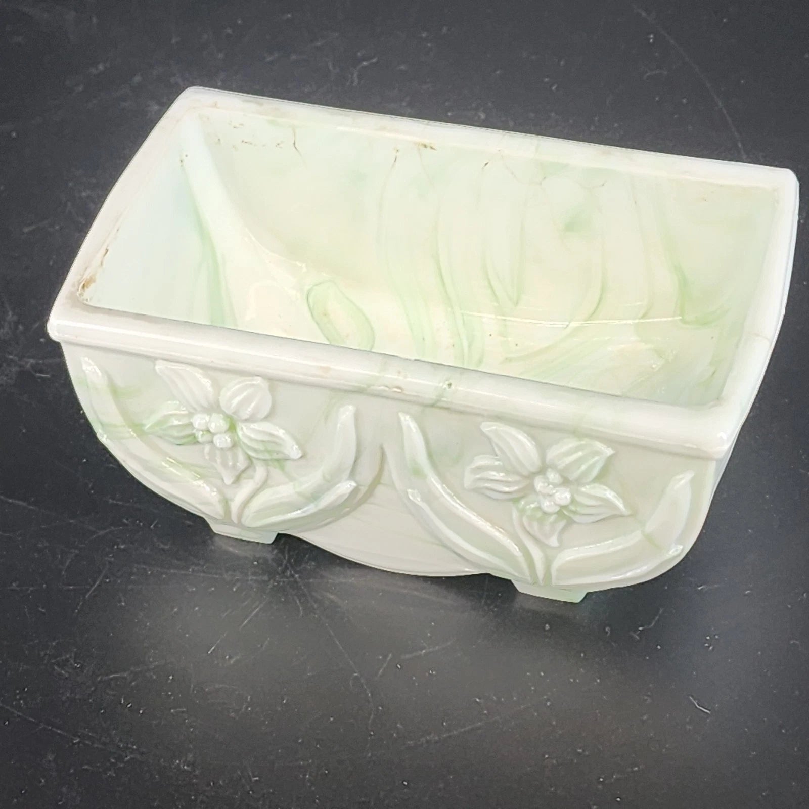 Akro Agate Slag Glass Planter Green White Marble Daffodil Floral Dish 1940's Vtg