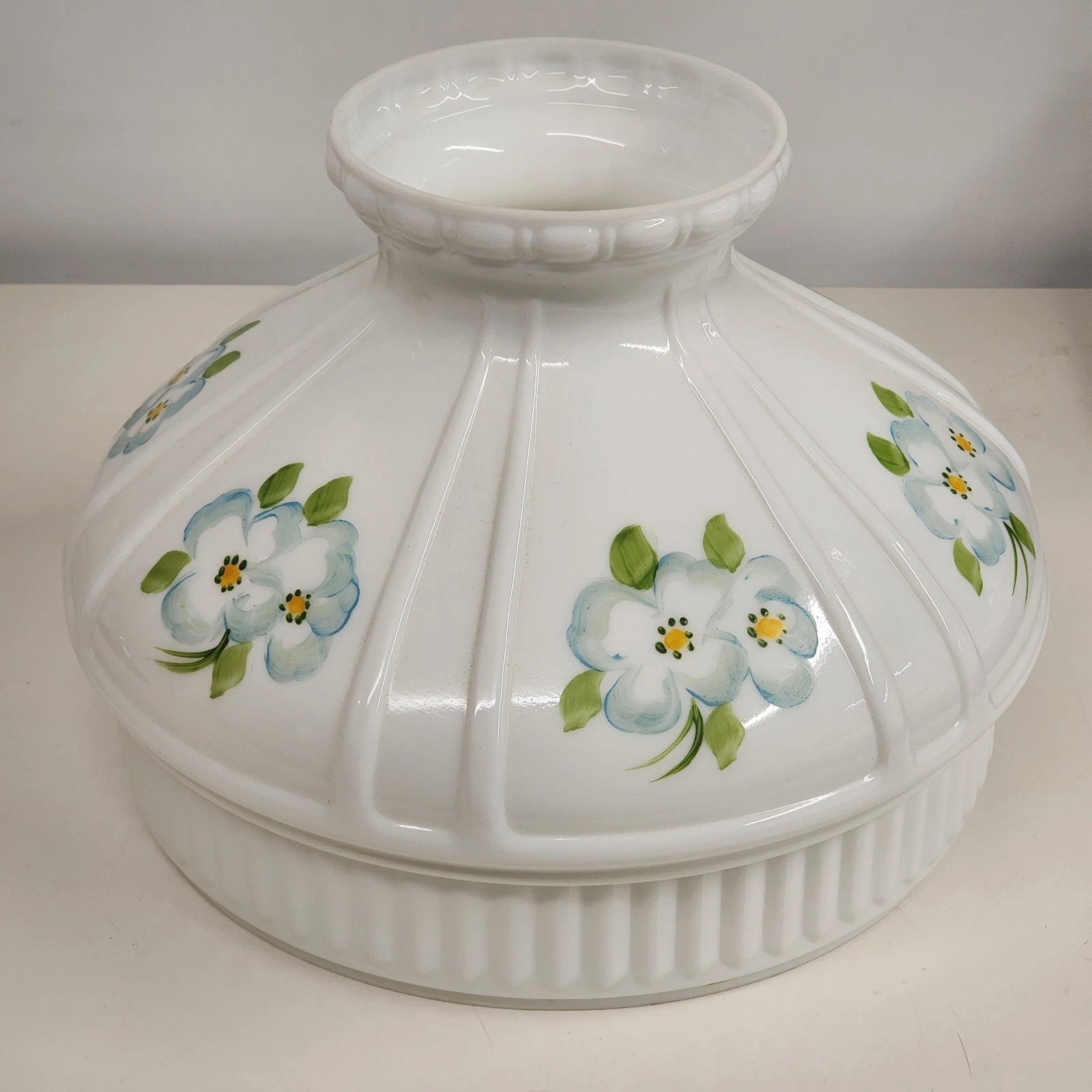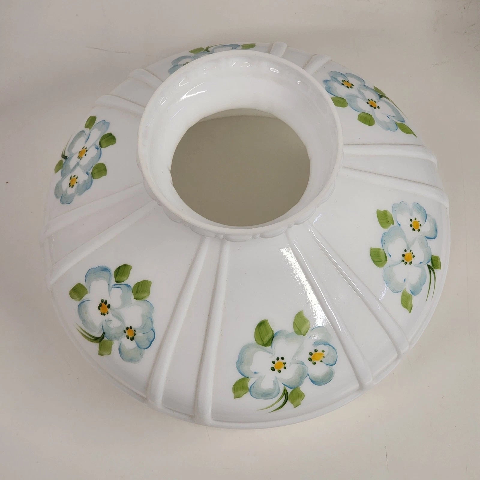 The shade is the Aladdin's Champagne shape in the white crystal dogwoods design which is hand painted. This is a 10" diameter x 8" tall glass beauty.