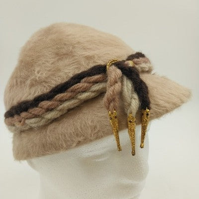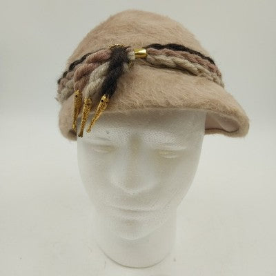 Chic and timeless, this Aloska beige felt fur cloche hat is accented with three rows of twisted rope trim in shades of brown, tan, and beige. A classic vintage style perfect for adding elegance to any outfit.
