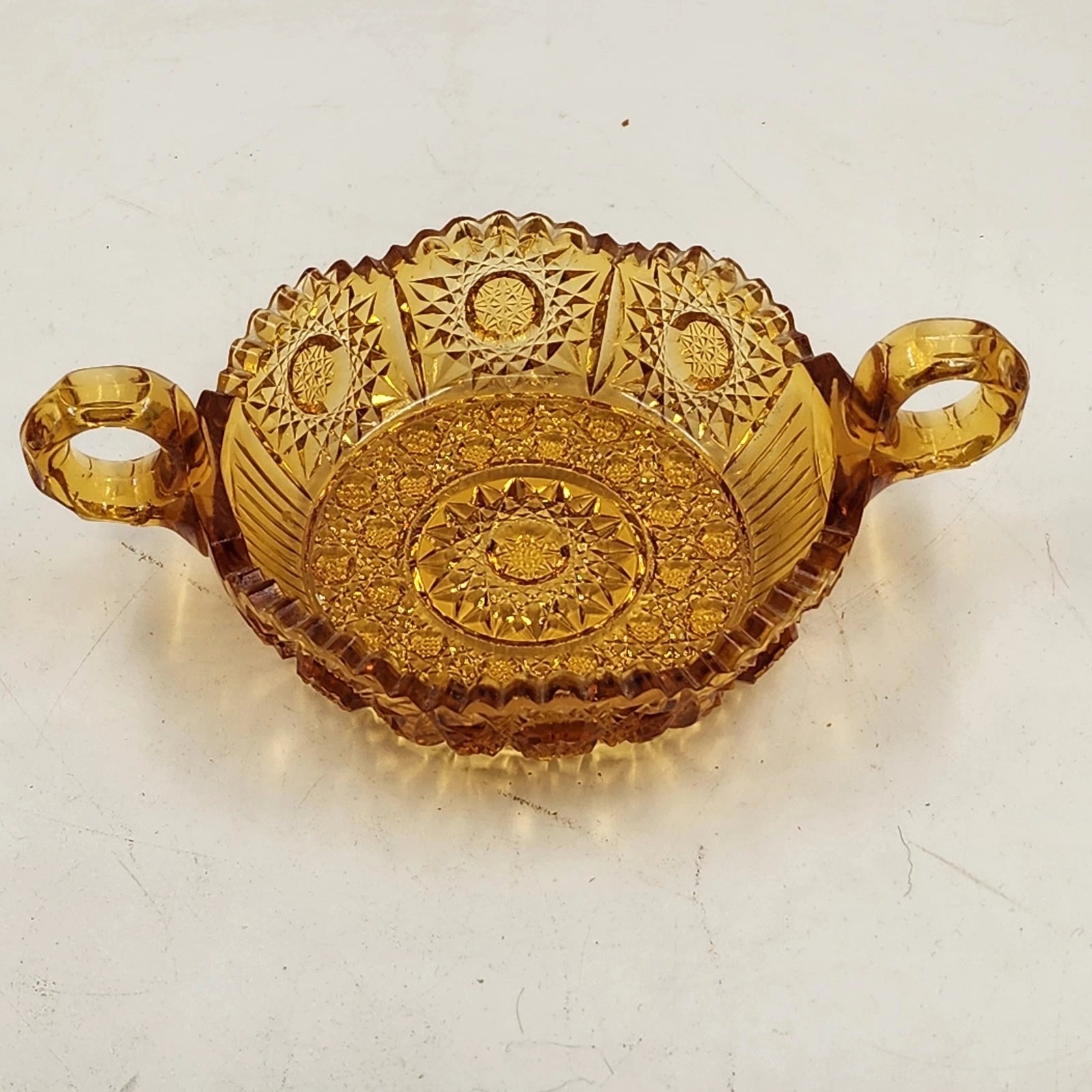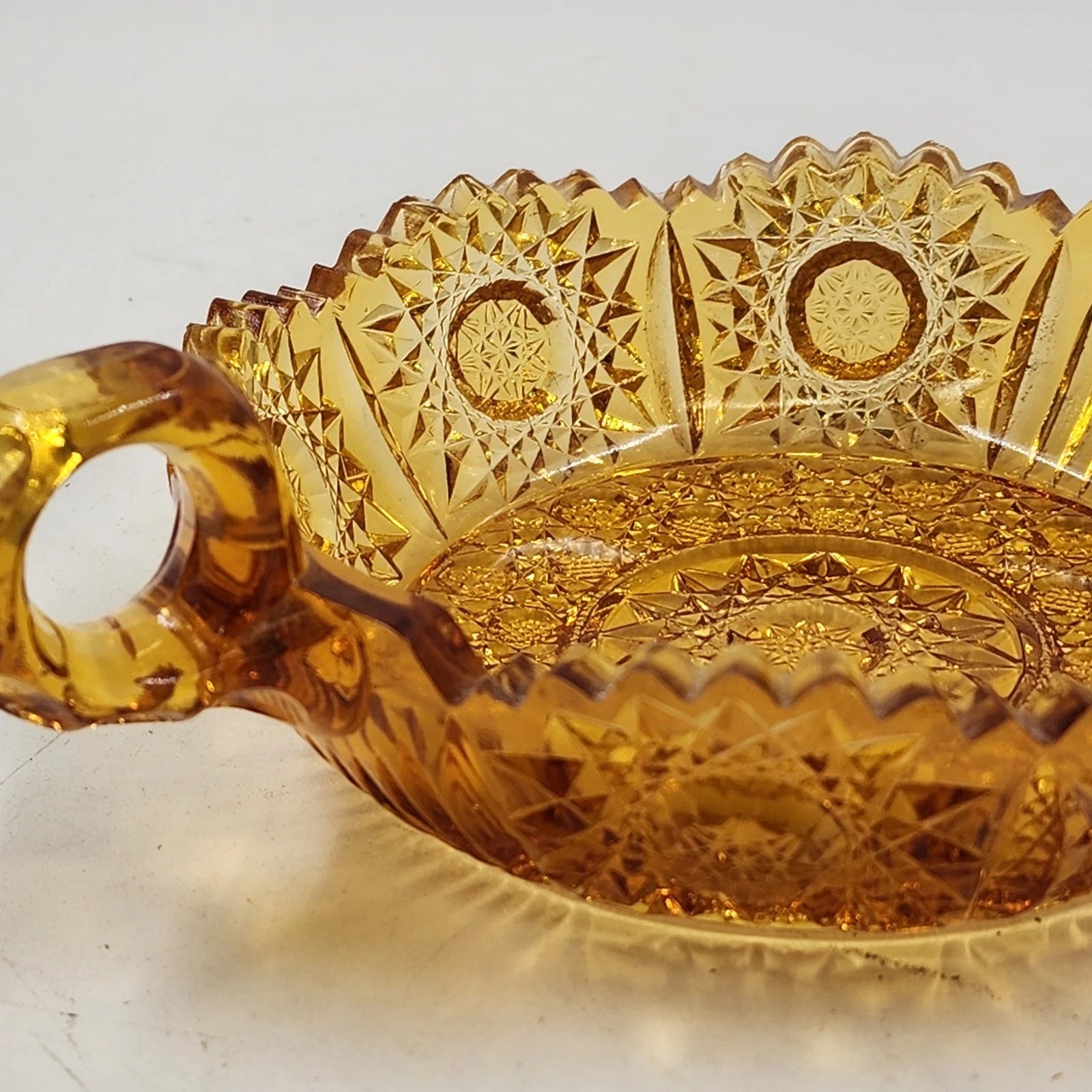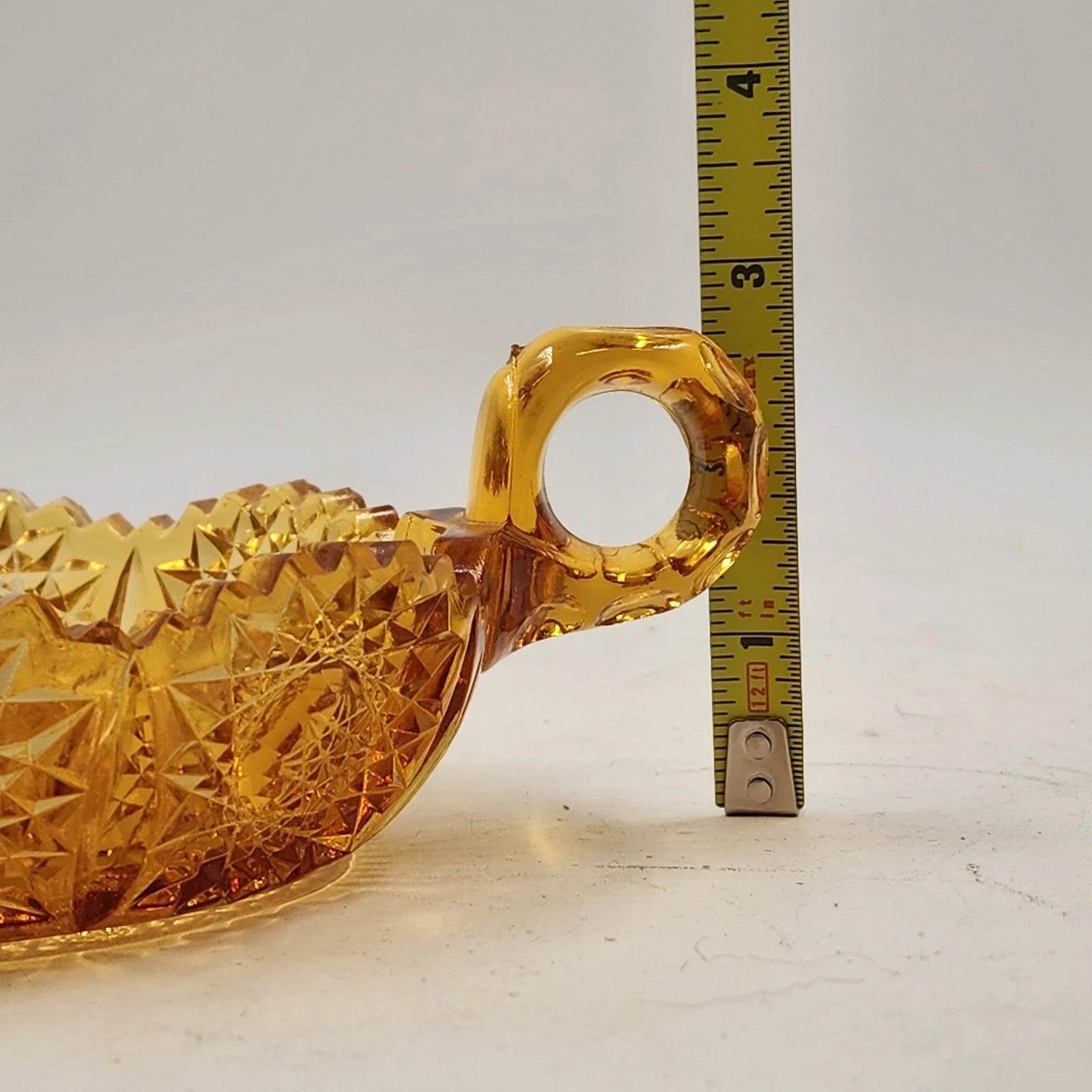This vintage Amberina cut glass nappy bowl features a beautiful Hobstar pattern with a sawtooth edge and dual handles for easy serving. Its rich amber color and intricate design make it an eye-catching piece for any table or display. Perfect for use as a candy dish, nut bowl, or decorative accent.