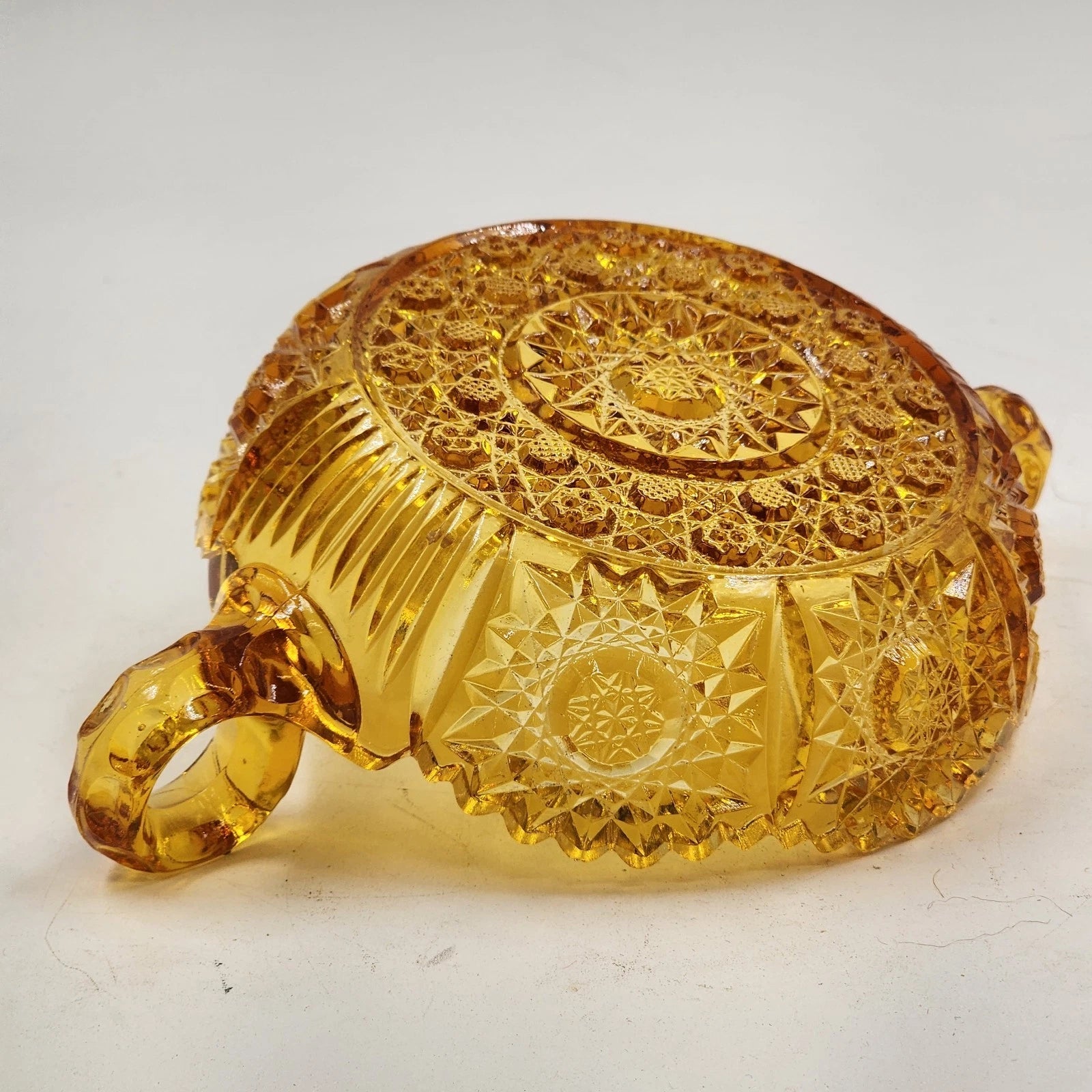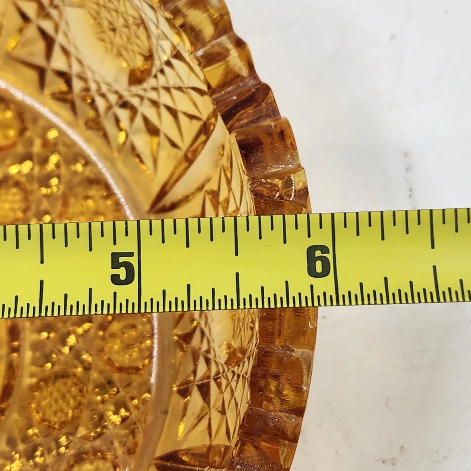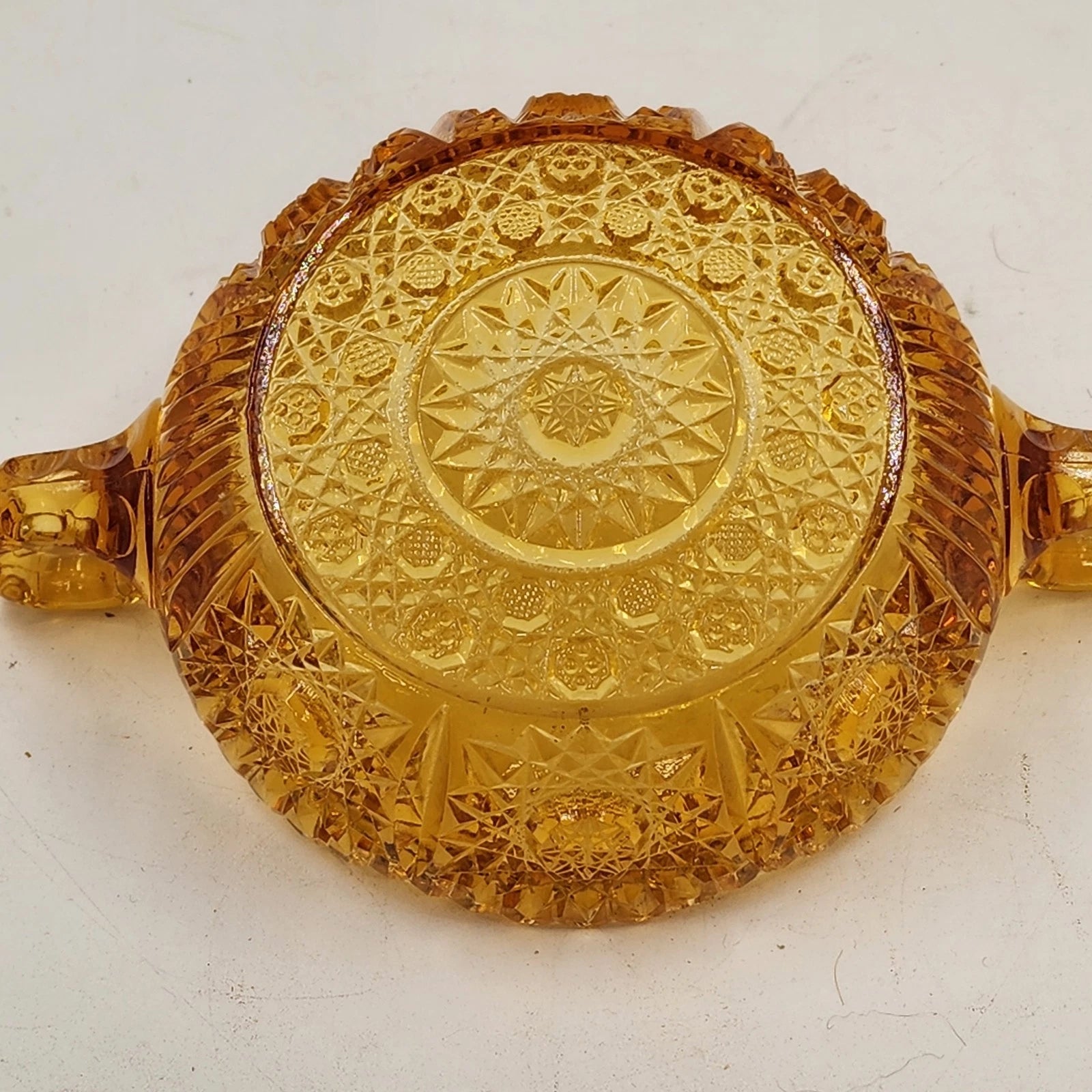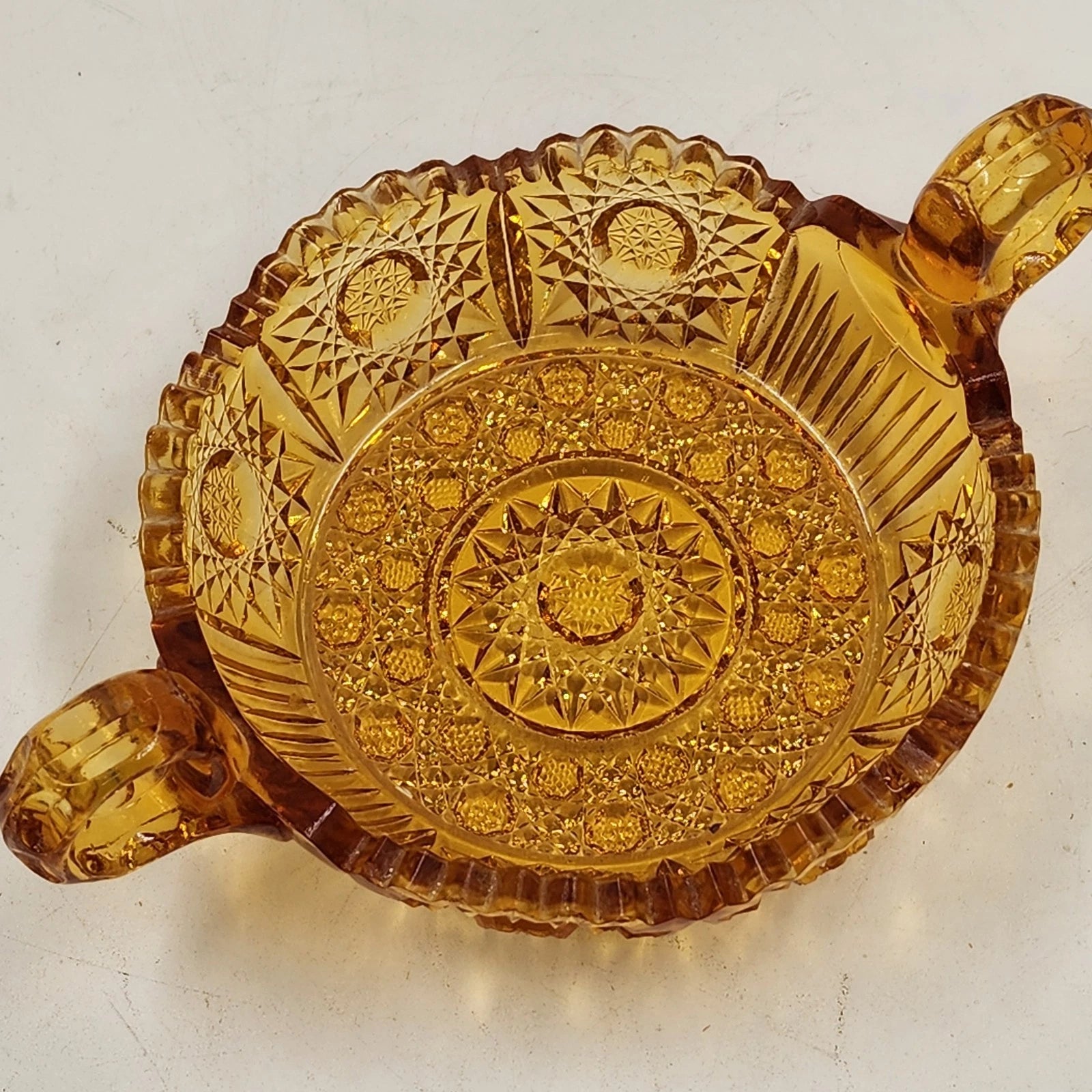 This vintage Amberina cut glass nappy bowl features a beautiful Hobstar pattern with a sawtooth edge and dual handles for easy serving. Its rich amber color and intricate design make it an eye-catching piece for any table or display. Perfect for use as a candy dish, nut bowl, or decorative accent.