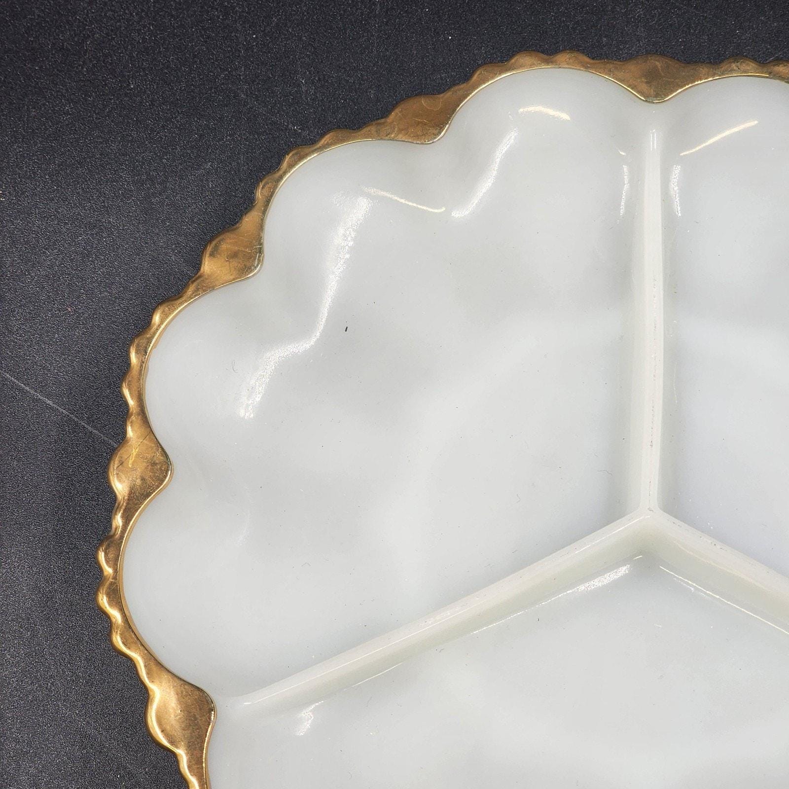 Anchor Hocking Milk Glass Divided Relish Dish with Gold Rim 10 Inch Vintage