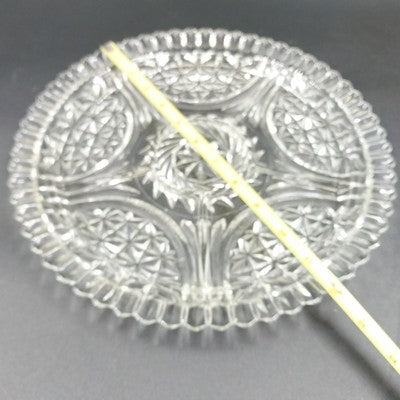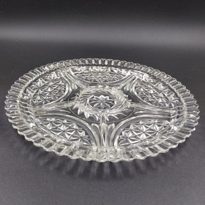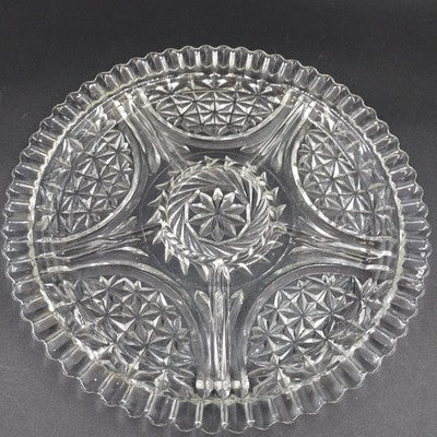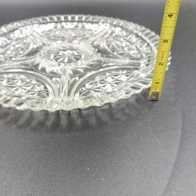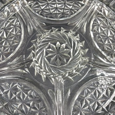 This vintage Anchor Hocking glass dish features the iconic Stars & Bars pattern, known for its intricate starbursts and linear cuts. With five divided sections and a generous 12" diameter, it's perfect for serving candies, relishes, vegetables, or as a collectible display piece.