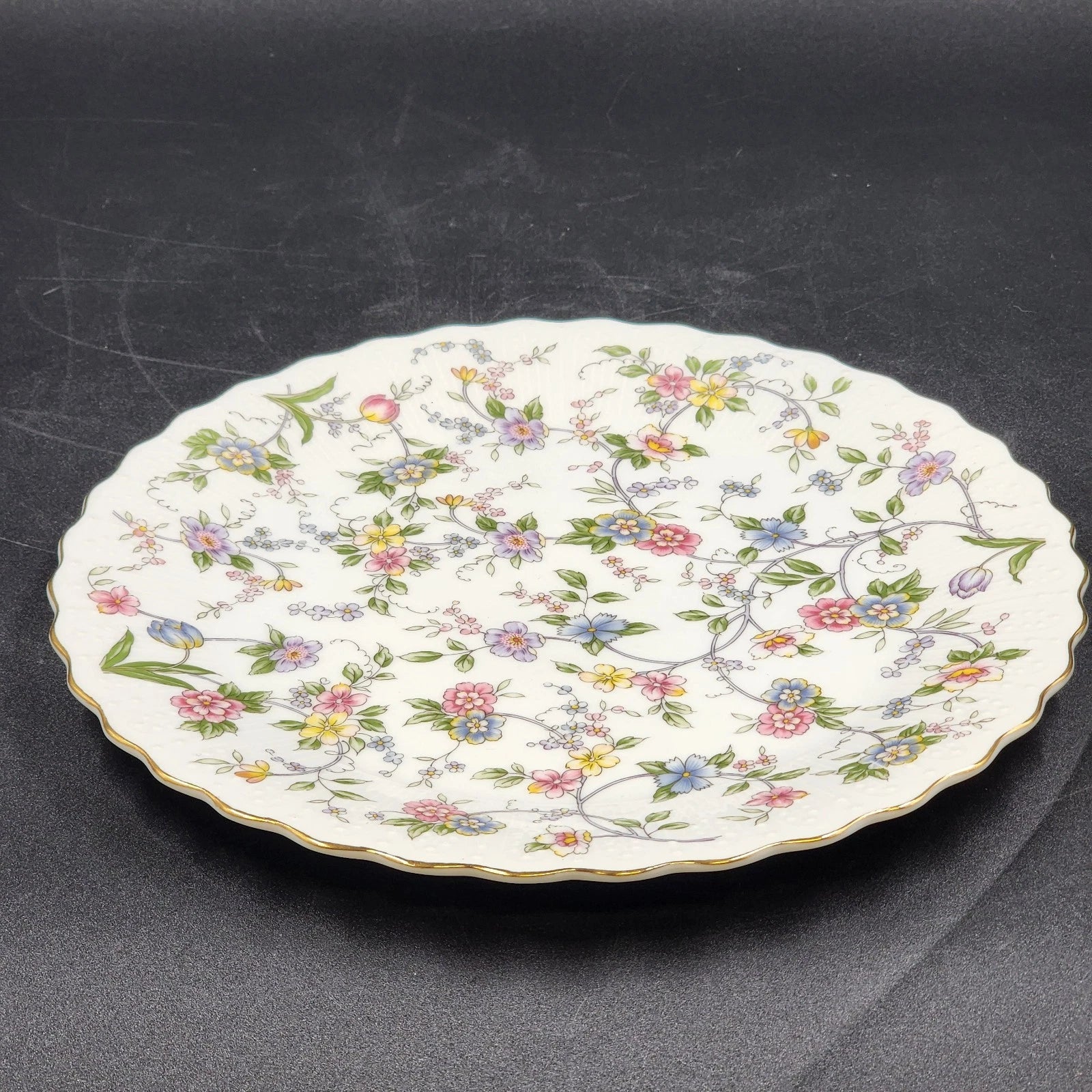 Add timeless charm to your table with this vintage Andrea by Sadek cake platter featuring the elegant Corona floral pattern, scalloped edge, and delicate gold trim. A perfect piece for serving or displaying desserts in classic style.