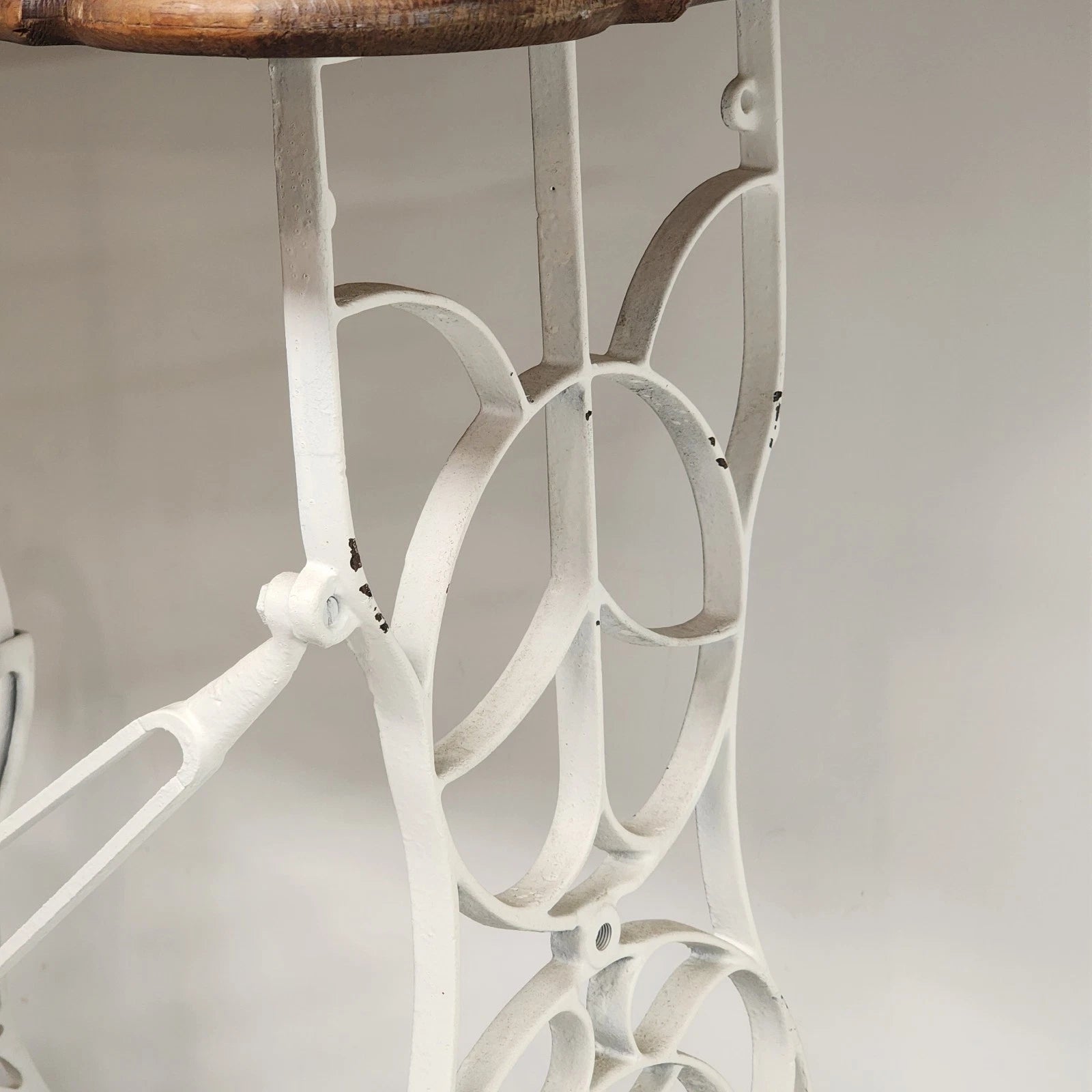 Bring a piece of industrial history into your home with this stunning antique Singer sewing machine treadle table. This piece features the iconic, heavy-duty black cast iron "scroll" frame that Singer is world-renowned for, complete with the original foot pedal and wheel mechanism. It has been repurposed with a beautiful wood top, transforming it into a versatile side table, desk, or entryway accent. Whether you are a sewing enthusiast or a fan of industrial farmhouse decor, this sturdy and timeless piece serves as both a functional furniture item and a conversation-starting work of art.