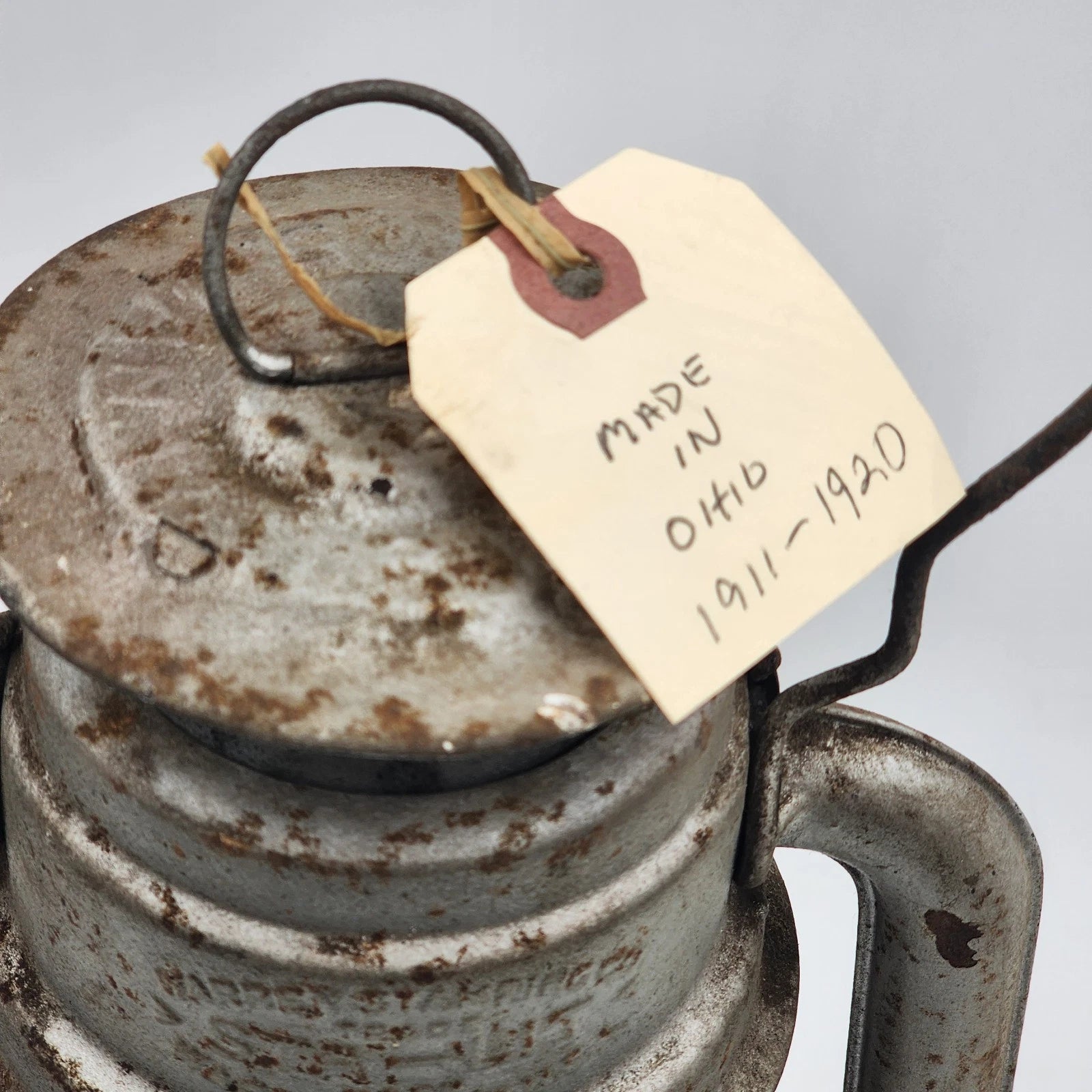 The lantern is all original, standing approximately 14 inches tall, and retains classic features like the cork fuel filler cover. It makes a wonderful, rustic accent piece for farmhouse decor, cabins, or for antique collectors.