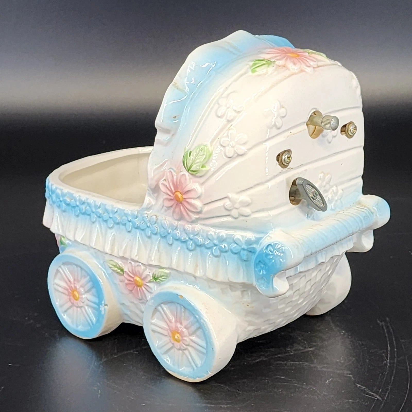 Celebrate a new arrival or add a touch of mid-century sweetness to your nursery with this vintage Ardco ceramic music box. Designed as a charming baby carriage (pram), it features a delightful pastel blue and pink color palette with embossed floral accents. This piece isn't just a decorative figurine-it's a fully functional music box that plays a gentle, soothing melody perfect for a child's room. Crafted in Japan with the attention to detail Ardco is known for, this piece is a wonderful keepsake for collectors of vintage nursery items or anyone looking for a nostalgic baby shower gift.