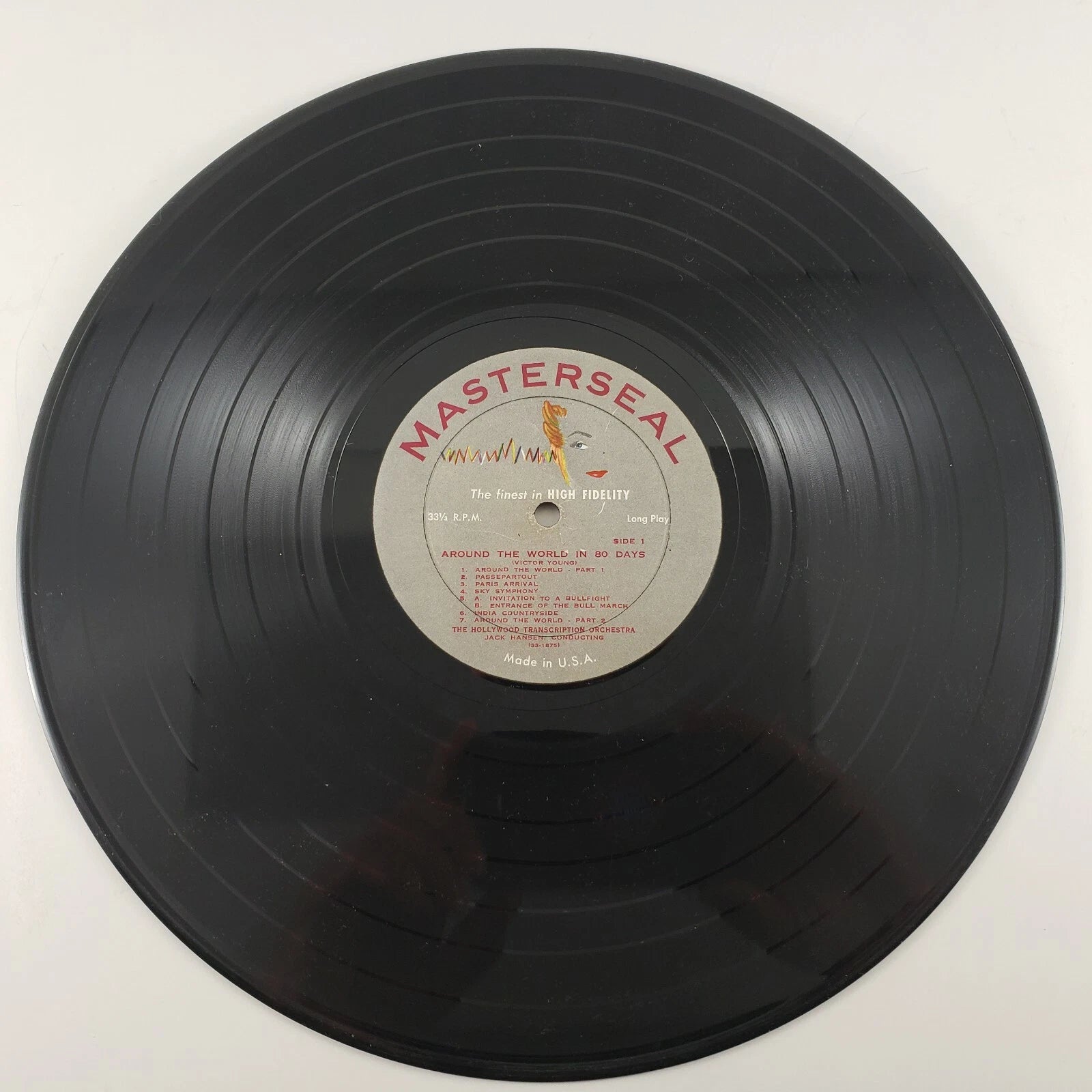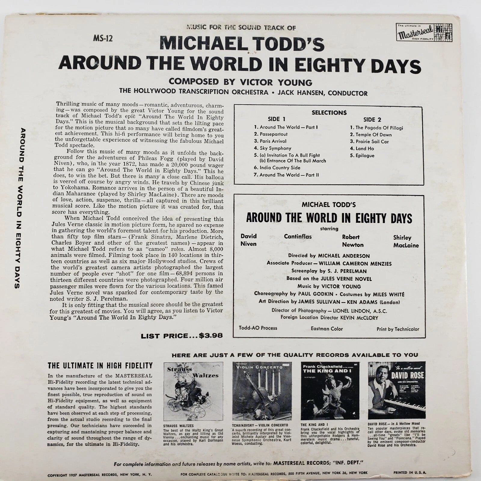 Original 1957 High Fidelity soundtrack recording for Michael Todd's Around The World In 80 Days, composed by Victor Young. 12" vinyl LP on Masterseal Records. Classic film score collectible with rich orchestral sound. Cover is split and inner sleeve has been replaced, vinyl in Very Good+ condition.