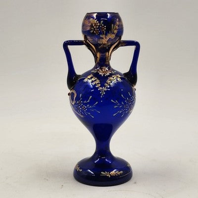 Art Nouveau Bohemian Cobalt Blue Glass Vase with Heavy Gold Gilding – 8" Tall – Dual Handles & Globe Top – Vintage European Display Piece