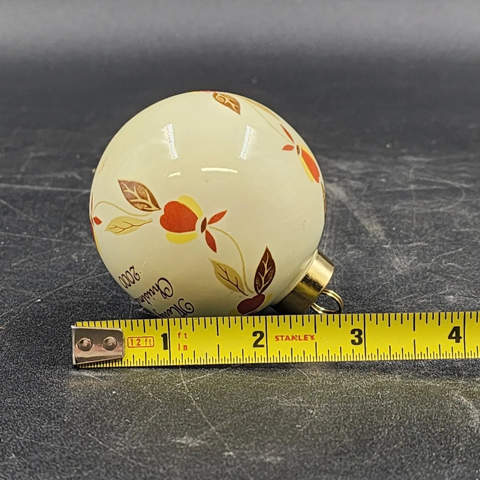 This is the Fourth Annual Autumn Leaf Ornament, a highly sought-after collectible released in 2000 as a China Specialties Exclusive Edition of only 500 pieces. This beautiful Christmas bauble features the classic Autumn Leaf floral design, the text "Merry Christmas," and has a gold-tone cap and ring for hanging.