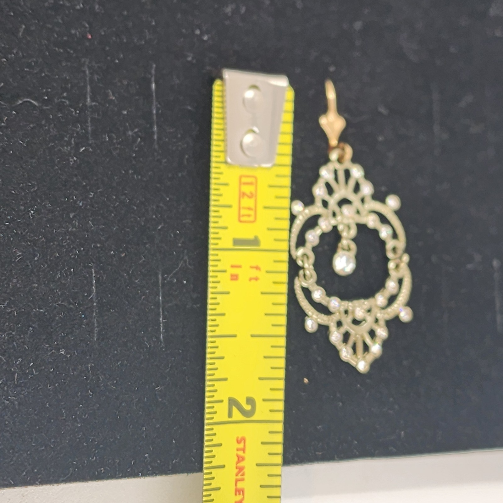 Earrings: 1.5-inch filigree & rhinestone dangle with gold tone lever backs
